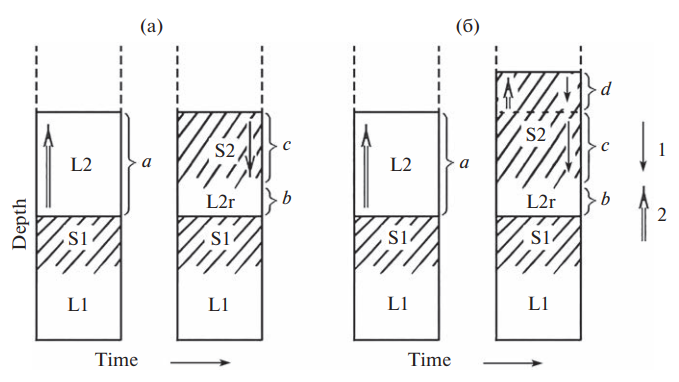 Рис. 5. Схема фаз развития аллювия поймы и погребенных почв. (а) – сценарий 1 (простой). Стадия накопления слоя аллювия (L2) сменяется стадией формирования почвы (S2), в течение которой седиментация отсутствует. Скорость седиментации вычисляется для исходной мощности слоя аллювия (“a”). (б) – сценарий 2 (сложный). Почва S2 – кумулятивная, она частично развивается вглубь, частично прирастает вверх, что обозначено стрелками 1 (педогенез) и 2 (седиментация). Скорость седиментации для периода развития почвы S2 рассчитывается только для слоя, накопившегося за это время (“d”). Для исходного слоя аллювия (L2), на котором сформировалась эта почва, она та же, что и в сценарии 1. Остальные обозначения объясняются в тексте. Fig. 5 . Diagram of the phases of floodplain alluvium and buried soils development. (а) – scenario 1 (simple). The stage of accumulation of the alluvium layer (L2) is replaced by the stage of soil formation (S2), during which there is no sedimentation. The sedimentation rate is calculated for the initial thickness of the alluvium layer (“a”). (б) – scenario 2 (complex). The soil 2 is cumulative, it partially develops in depth, partially grows upwards, which is indicated by arrows 1 (pedogenesis) and 2 (sedimentation). The sedimentation rate for the period of soil development S2 is calculated only for the layer accumulated during this time (“d”). For the original alluvium layer (L2) on which this soil formed, it is the same as in Scenario 1. Other designations are explained in the text.