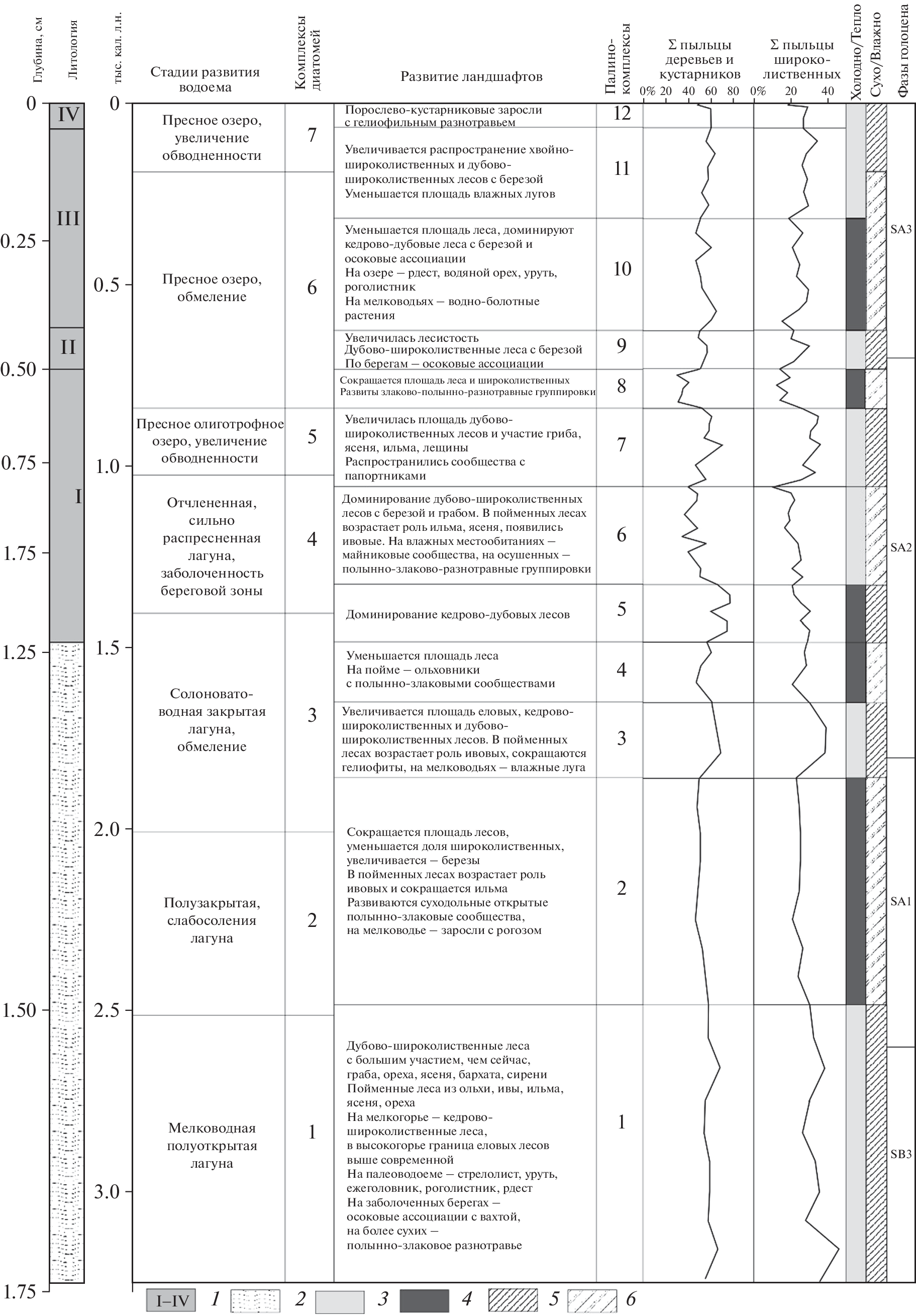 A continuous record of paleogeographic events in south-eastern Primorye has been reconstructed based on the deposits of Gniloe Lake. The lake is located on the northern coast of Nakhodka Bay. Starting from 3240 cal. BP. 5 warming periods were identified: 3240–2500, 1865–1653, 1330–838, 733–624 cal. BP and from the second half of the 17th century to the present; 4 periods of cooling: 2500–1865, 1653–1330, 838–733 and 624–322 cal. BP; 6 wet periods: 3240–2500, 1865–1653, 1479–1330, 1056–838, 733–624 cal. BP and last 280 years; 5 dry periods: 2500–1865, 1653–1479, 1330–1056, 838–733 and 624–210 cal. BP. According to palynological analysis, the expansion of Pinus koraiensis and dark coniferous species occurred during the second phase of the Mid-Subatlantic cooling of 1479–1330 cal. BP. In the last 150 years, the most significant changes have been associated with the anthropogenic transformation of landscapes as a result of urbanization. The area of forests and their species composition have decreased. At present, shrubs have occupied areas of the deforested oak forests. Based on the results of diatom analysis, 7 stages of the development of Gniloe Lake were identified. There was a shallow semi-open lagoon at a sea level 1–1.5 m higher than the present day about 3240 cal. BP. Cooling and decrease in humidity about 2500 cal. BP led to the formation of a slightly saline semi-enclosed lagoon. Shallowing of the lagoon about 2000 cal. BP was due to a decrease in sea level. Finally, the lagoon separated from the sea about 1450 cal. BP. The transformation of the lagoon into a fresh lake occurred around 1080 cal. BP. During the period of cooling 840–733 cal. BP the shallowing of the lake began, which continued in the Little Ice Age. The increase of the lake level associated with moderate warming and an increase in humidity began at 210 cal. BP. Traces of three catastrophic events were recorded in the sediments of Gniloe Lake – a high-intensity storm about 3000 cal. BP and 2 tsunamis around 2000 and 1560 cal. BP.