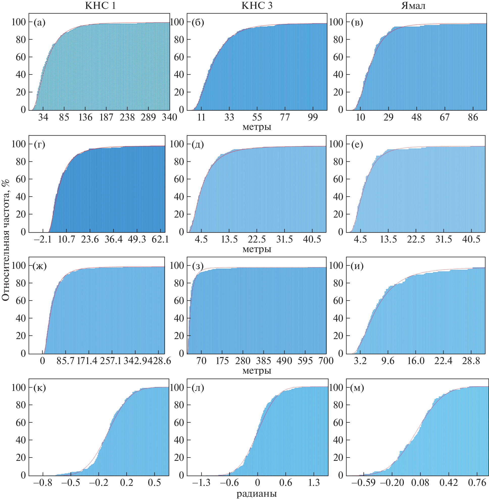 Coast landslide processes take a special place in the study and monitoring of processes in permafrost under the climate change, however, not much attention has been paid to the morphology and quantitative characteristics of the landslides. The aim of the work is to reveal quantitative relationships between the abrasion slopes and a landslide process for coasts within the cryolithozone, mainly in contact with the adjacent interfluves. The research is based on the interpretation of high-resolution space imagery at five costal sites of the Kanin and Yamal peninsulas. The study was focused on the morphological features of the upper part of the landslides at the border with the adjacent interfluve. This border is a combination of arc elements. Besides, there are arcuate residual sections of the interfluve surface, corresponding to different stages of landslide process, in some places on the slope. Analysis of the coastline from images gave us such characteristics of landslides as the length of the arcs forming the boundary, the length of the chords of the arcs, the arrows of the arcs, the average radii of curvature, the central angles of the arc, the angles of orientation of the chords with respect to the vector of the general strike of the corresponding section of the coastline. Some of these characteristics were obtained by direct measurement from satellite images, the others by calculation. The analysis included 30 samples with a volume of 103–183 elements. Statistical processing using Pearson’s goodness-of-fit test showed that in the vast majority of the sites, the distributions of the landslide upper boundary arc sizes, chords, arc arrows, and curvature radii, as well as central angles, correspond to a lognormal one. The chord orientations with respect to the strike of the site are normally distributed. The values of the distribution parameters of the studied quantitative characteristics of the landslide morphological features differ and depend on the physical-geographical and engineering-geocryological conditions of specific areas.