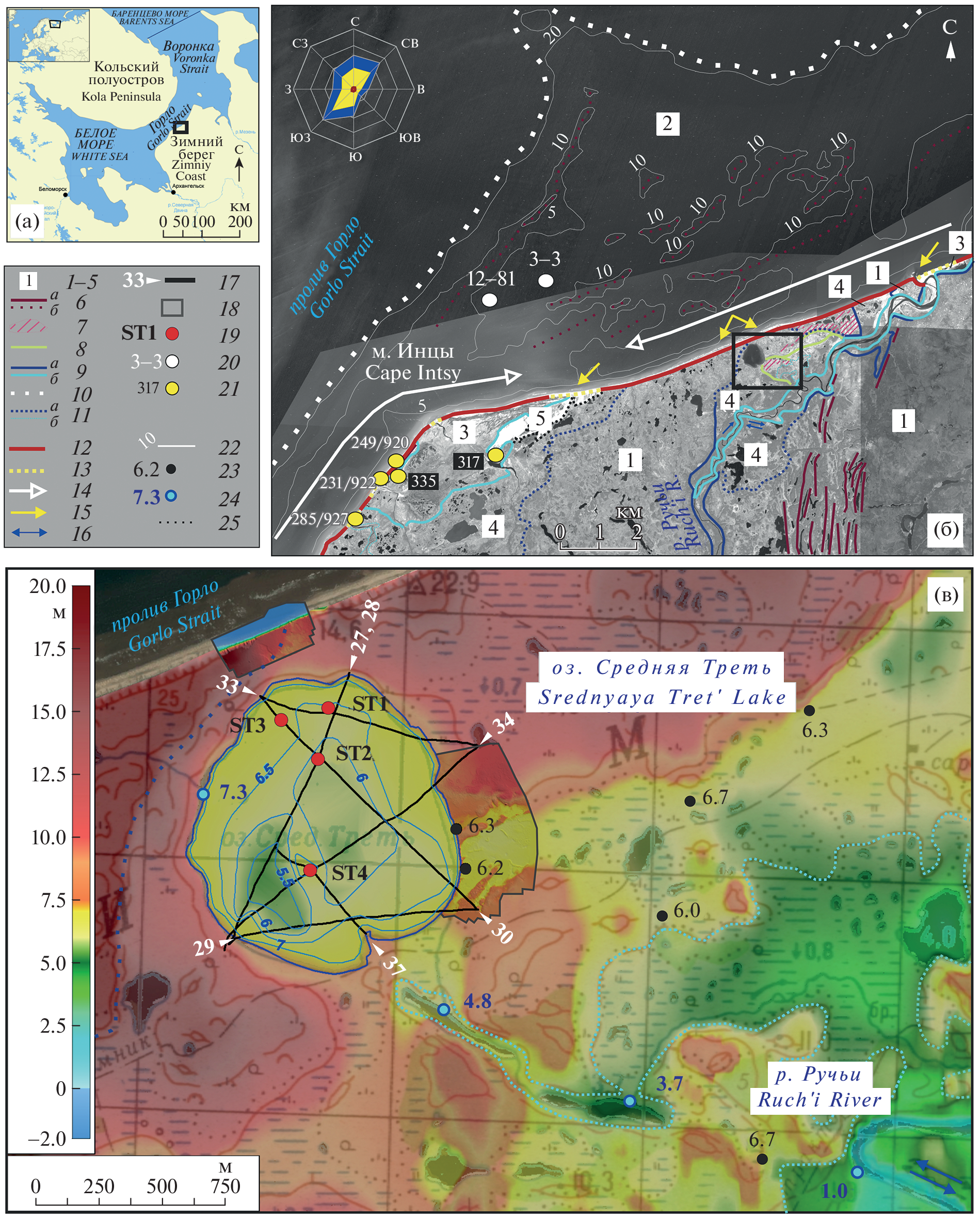 The relative sea-level changes for the time interval of ~12.1–9.1 ka cal BP were reconstructed on the eastern coast of the Gorlo Strait using the results of paleolimnological, GPR and geomorphological analyses conducted in the basin of the Srednyaya Tret’ Lake (7.3 m a.s.l., 66.014009° N, 41.086294° E), as well as UAV surveying of the lake surroundings. Bottom sediments of the lake were studied from the four core sections and correlated with each other according to the results of GPR data interpretation. Lithostratigraphic descriptions of bottom sediment cores, grain-size and diatom analyses, radiocarbon dating (AMS), determination of LOI, Corg content and Corg /Norg ratio were performed. We present the reconstruction of the coastlines at heights of 4–5 and 12–15 m formed by currents and/or wave processes within the lower Ruch’i River valley and Srednyaya Tret’ Lake according to field observations and interpretation of space images. As a result, the position of the relative sea-level and the chronology of the Late Glacial (Younger Dryas) transgression and the early stages of the Holocene (Tapes) transgression were refined. Late glacial transgression finished earlier than ~12.1 ka cal BP, and its relative level was probably no higher than 15 m a.s.l. After a deep regression, the relative sea-level approached the modern again ~9.5 ka cal BP, and at the Tapes transgression maximum (~9.1 ka cal BP) it was near the lake runoff threshold (∼5 m). Though the coastline was near the lake basin, sea waters never entered the lake. Sands, carried by the wind, accumulated in the part of the basin facing the coast. The the Srednyaya Tret’ Lake basin was gradually filled by fresh water according to the results of diatom analysis.