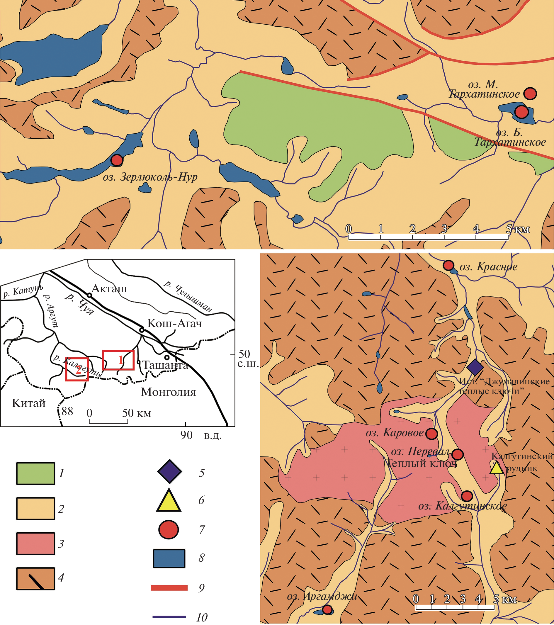 Numerous modern lakes appeared in the intermountain basins and on the high-elevation plateaus of Altai within the immediate distribution of glaciation in the Neo-Pleistocene. There is little known about the geochemical processes of autigenic mineral formation in lake systems under conditions of nival sedimentogenesis. The study of cores of bottom sediments of 8 high-altitude lakes of Altai showed that the waters of the lakes are fresh bicarbonate with variations in the cationic composition of Ca–Na. The bottom sediments of lakes are characterized by different ratios of mineral detrital material, autigenic minerals (calcite, gypsum, pyrite, illite) and mortmass of plant residues. In the bottom sediments of lakes located within the same basin (Bertek or Tarkhatinskaya), the absolute concentrations of elements differ within one standard deviation, with the exception of significant variations in the contents of individual elements (Mo, U, Li, Be). The enrichment of bottom sediments of lakes (Argamdzhi, Teply Klyuch, Krasnoe) with these elements is associated with the presence of ore concentrations (Mo, U, Li, Be) in the local catchment areas of a single lake. The mineral associations of the sediments of the studied lakes differ from each other in the composition of autigenic minerals, and from rocks, soils of catchment areas in the composition of layered silicates. In the composition of fine-scaled, tangled fibrous aggregates of the bottom sediment illite, the amount of iron is 2-4 times greater than in the composition of lamellar aggregates of micas, chlorites from rocks, soils of catchment areas. Cryogenic processes have determined the crystallization of gypsum nodules in the lakes Argamdzhi and Small Tarkhatinskoye; and calcite aggregates in Zerlyukol-Nur and Large Tarkhatinskoye in significant volumes for lakes with fresh water composition.