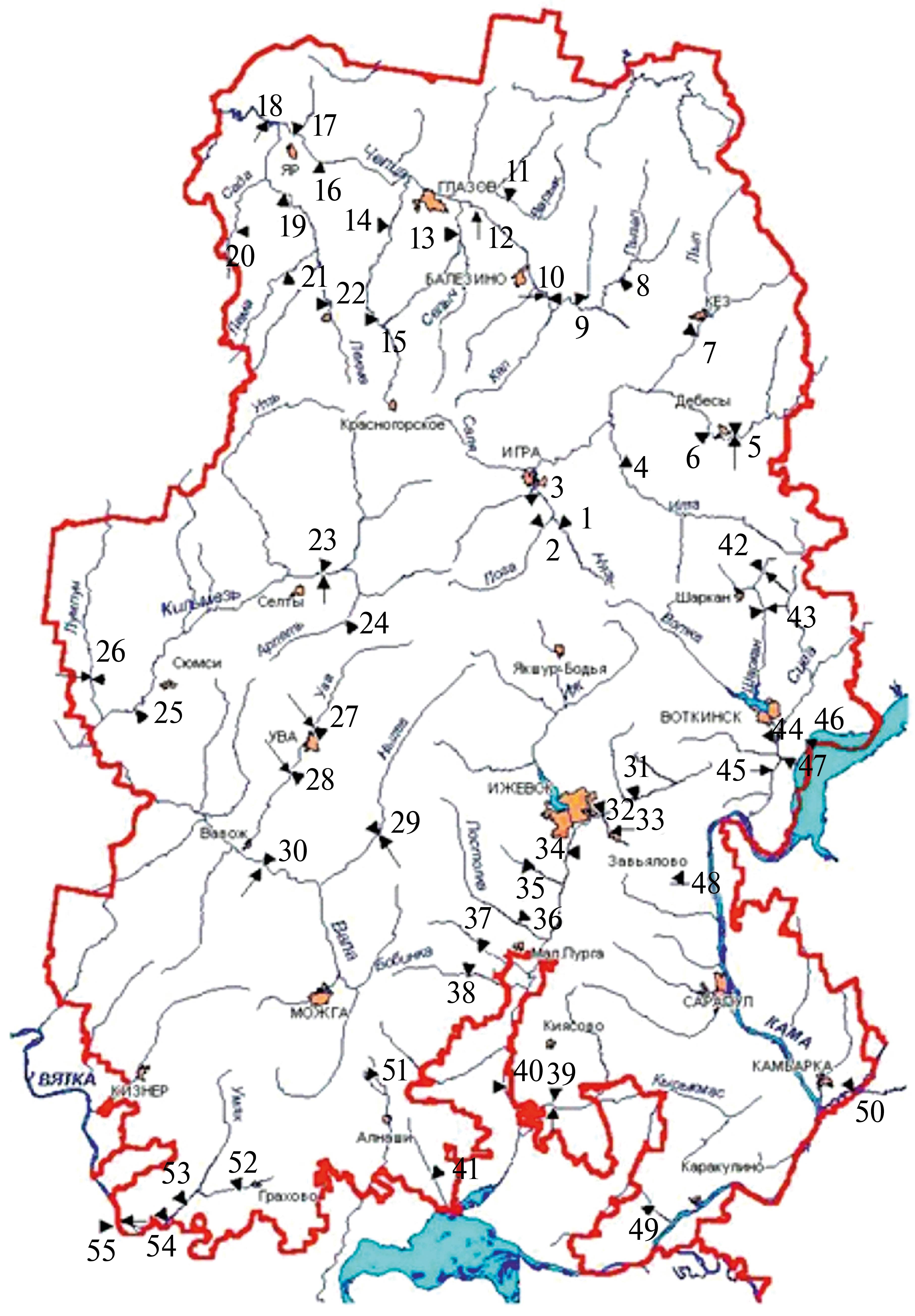 Fig. 1. Map-diagram of the location of key sites for the study of morphodynamics of riverbeds of the Udmurt Republic.