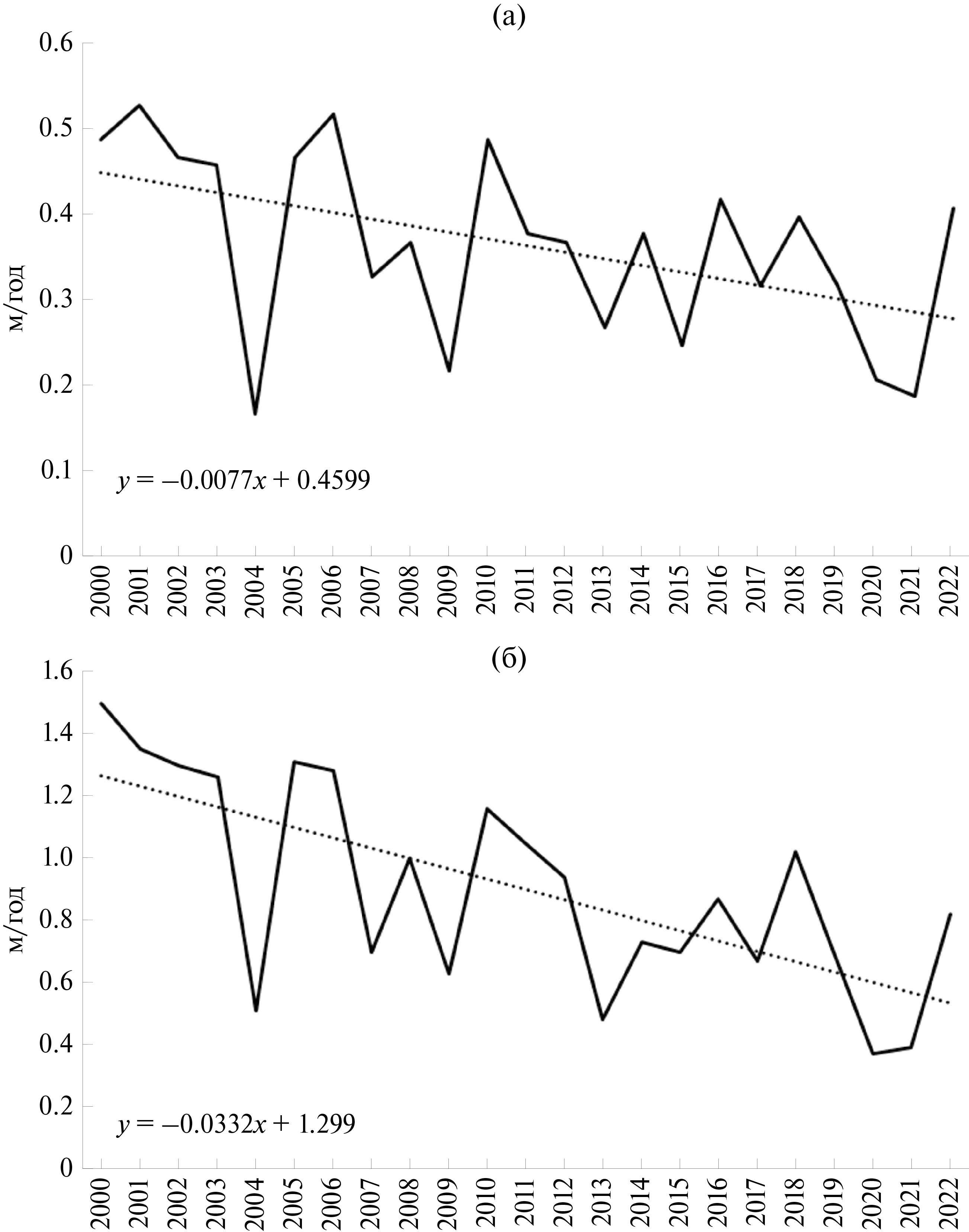 Fig. 3. Dynamics of average annual (a) and average maximum (б) erosion rates (m/year) on the rivers of Udmurtia for 2000–2022.
