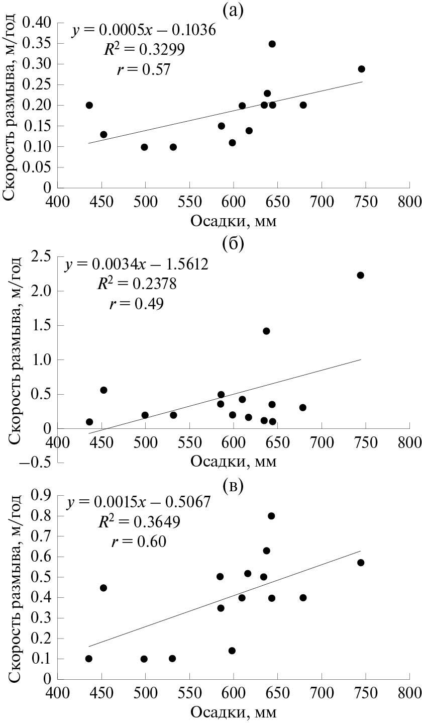 Поскольку расходы на реках зависят в первую очередь от суммы осадков, характера их выпадения, условий снеготаяния и других факторов, то нами была предпринята попытка определения статистических зависимостей между величиной бокового размыва на реках и годовой суммой осадков на ближайшей от участка наблюдения метеостанции. На рис. 6 представлены эти зависимости и коэффициенты связи для трех рек. Для очень малой р. Арлеть (порядок 6.0), впадающей слева в р. Кильмезь, получено уравнение линейной связи и рассчитаны показатели статистически достоверной связи (r = 0.57; R2 = 0.33) (рис. 6, (а)). Аналогичная зависимость установлена и для малой реки Кильмезь на участке “Головизнин Язок” (порядок 8.7), где получены менее значимые показатели связи (r = 0.49; R2 = 0.238) (рис. 6, (б)). Для другой малой р. Нылга (левый приток р. Вала), расположенной в бассейне р. Кильмезь, показатели связи оказались более значимыми (r = 0.60; R2 = 0.365). Для бассейнов других рек статистически достоверных связей не выявлено.