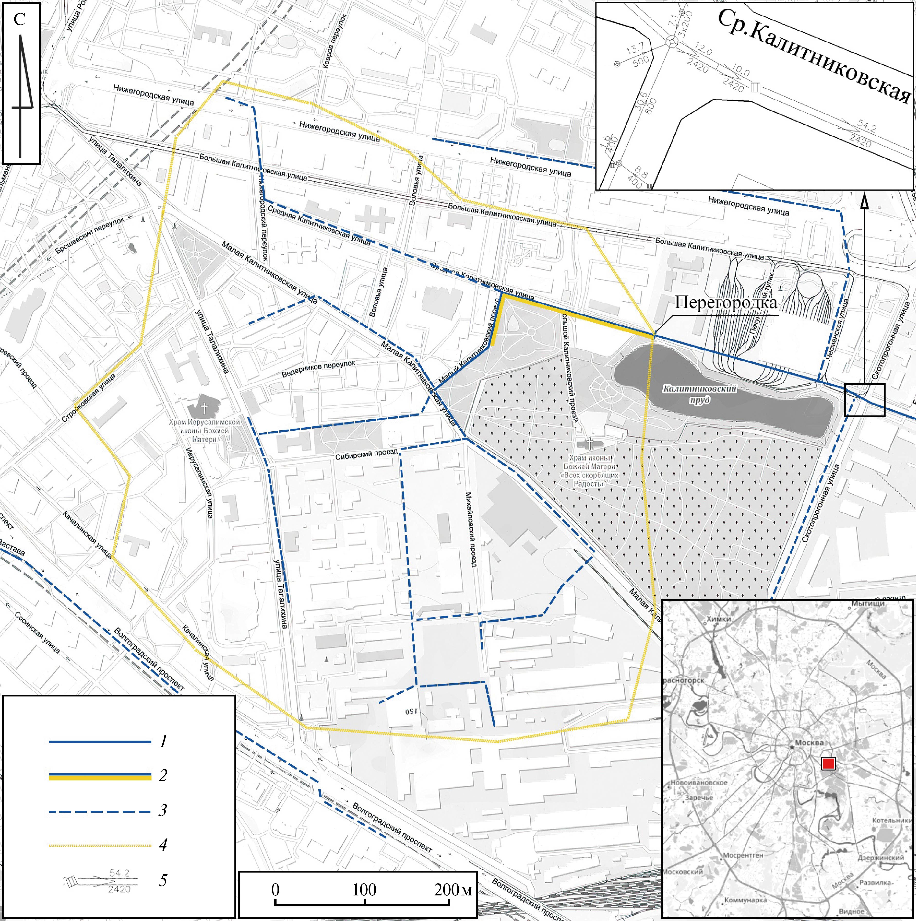 Зеркало копаного Калитниковского пруда и дно коллектора Калитниковского ручья расположены на абсолютной отметке 130 м. Наивысшие отметки в южной и северной частях водосбора едва достигают 140 м. Исследуемая местность находится на третьей надпойменной террасе Москвы-реки, рельеф которой характеризуется некрутыми задернованными склонами. Позднеплейстоценовые и голоценовые эрозионные врезы на этой поверхности при ее хозяйственном освоении нивелированы подсыпкой грунта на 2–4 м (Геологический …, 2010). Таким образом, если не учитывать склоны непосредственно вдоль копаного пруда, амплитуда высот изученной территории, базисом эрозии которой принимаются ливнесточные решетки, не превышает 5–6 м.
