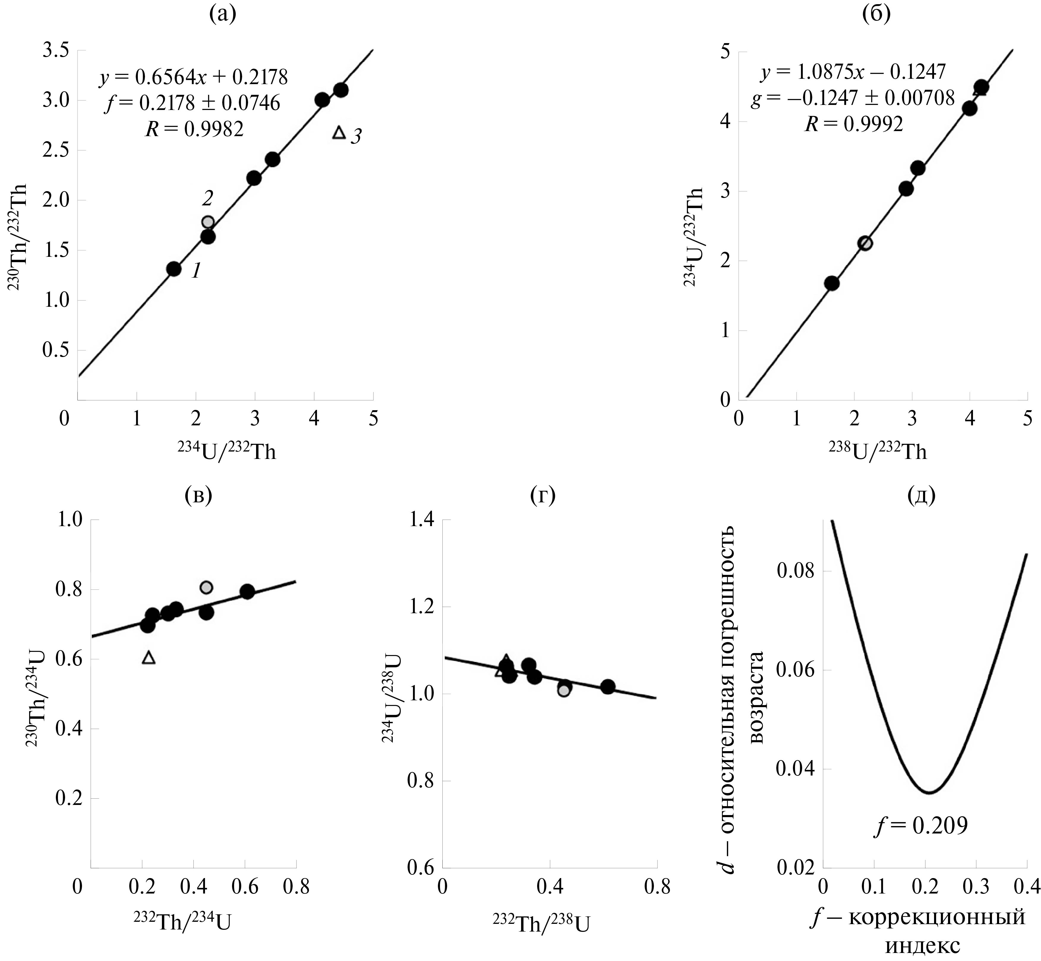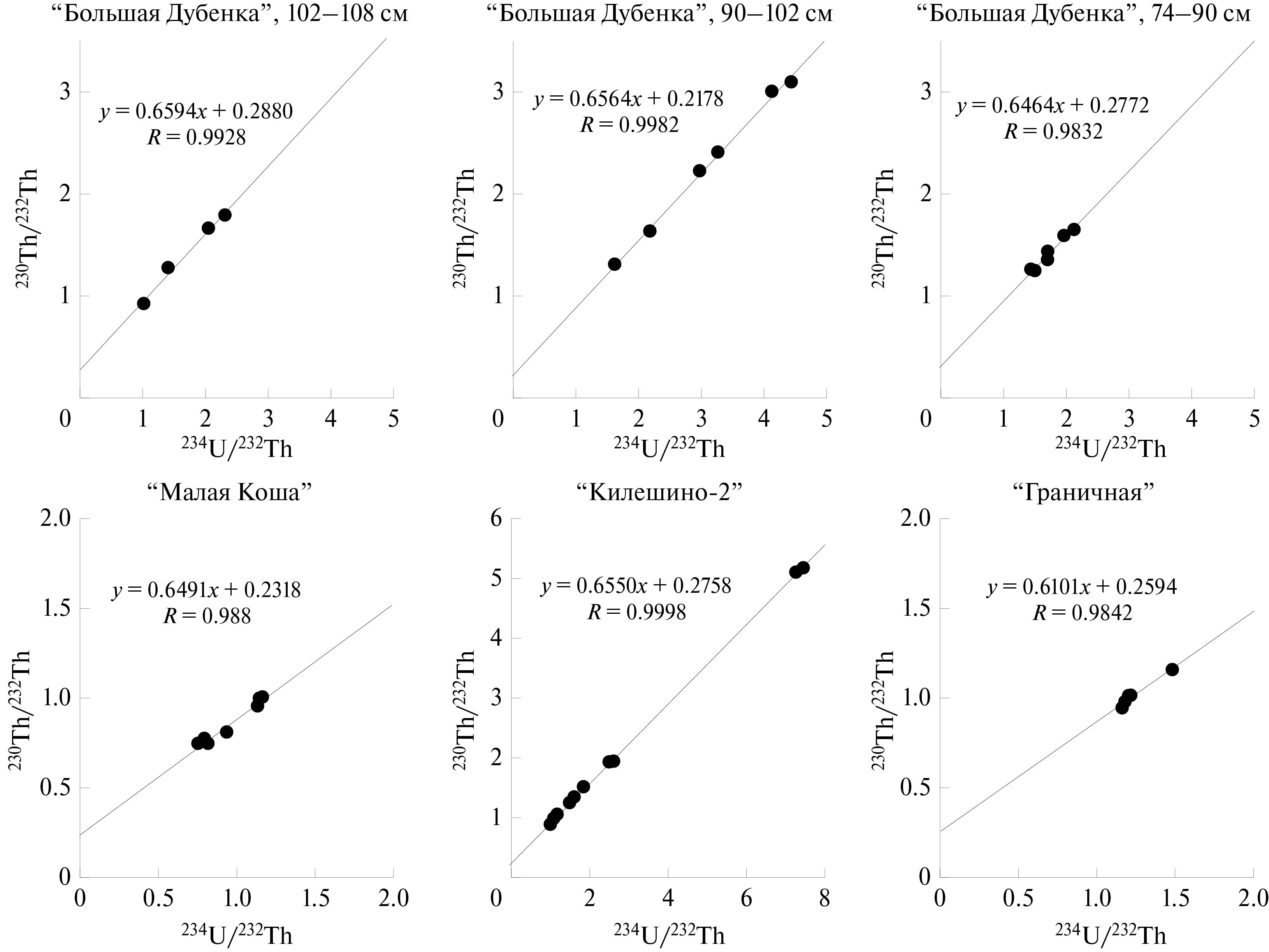 При изохронных построениях точки, соответствующие образцам — открытым системам, чаще всего отчетливо отклоняются от линейных зависимостей. Но в некоторых случаях это проявляется не столь явно. Кроме того, если в образцах есть несколько источников ториевого загрязнения, это может давать лишь небольшое отклонение от линейных зависимостей. Поэтому дополнительно мы использовали координаты ²³⁰Th/²³⁴U – ²³²Th/²³⁴U и ²³⁴U/²³⁸U — ²³²Th/²³⁸U, в которых несоответствие точек линейной регрессии проявляется более явно (Geyh, 2008; Максимов и др., 2022).