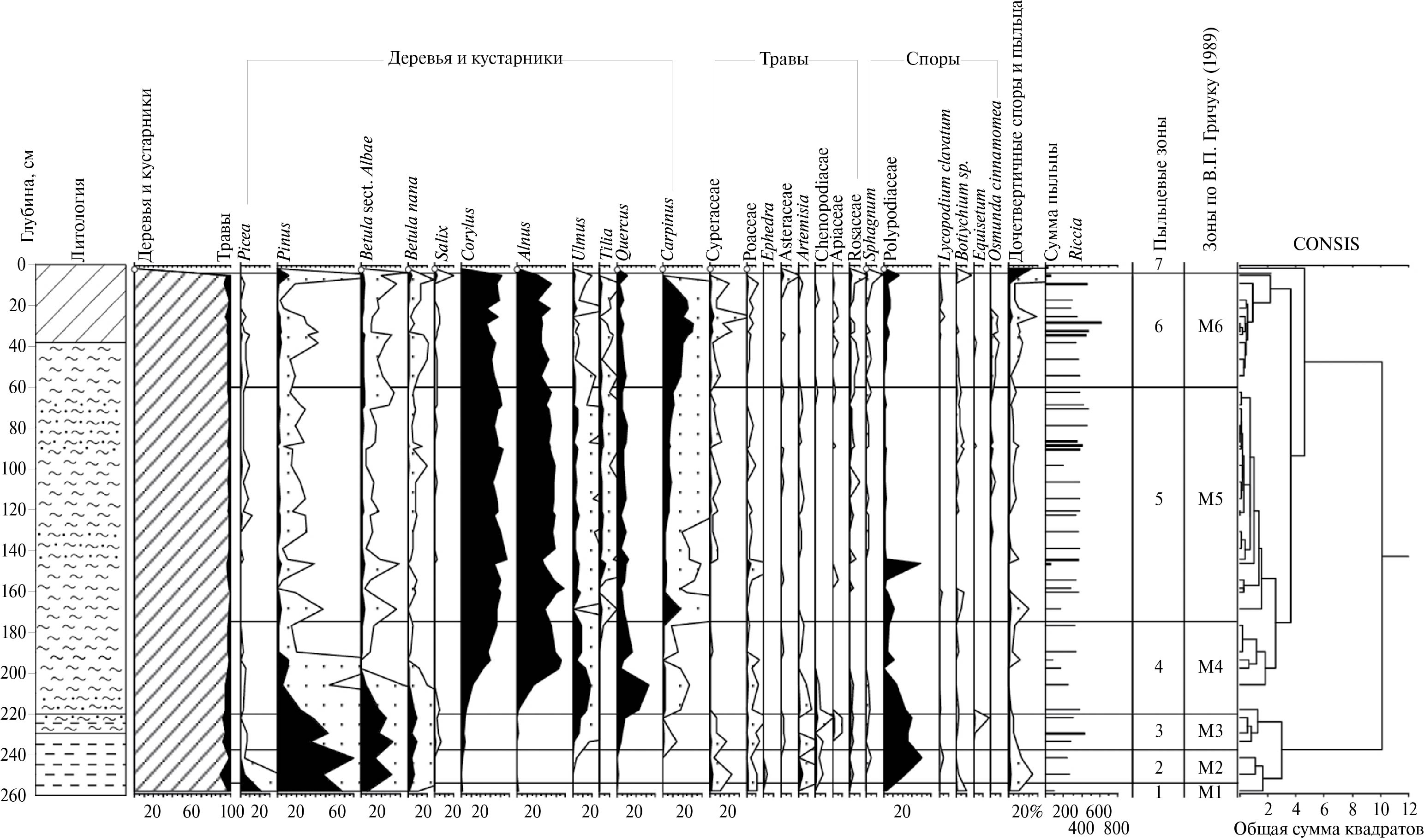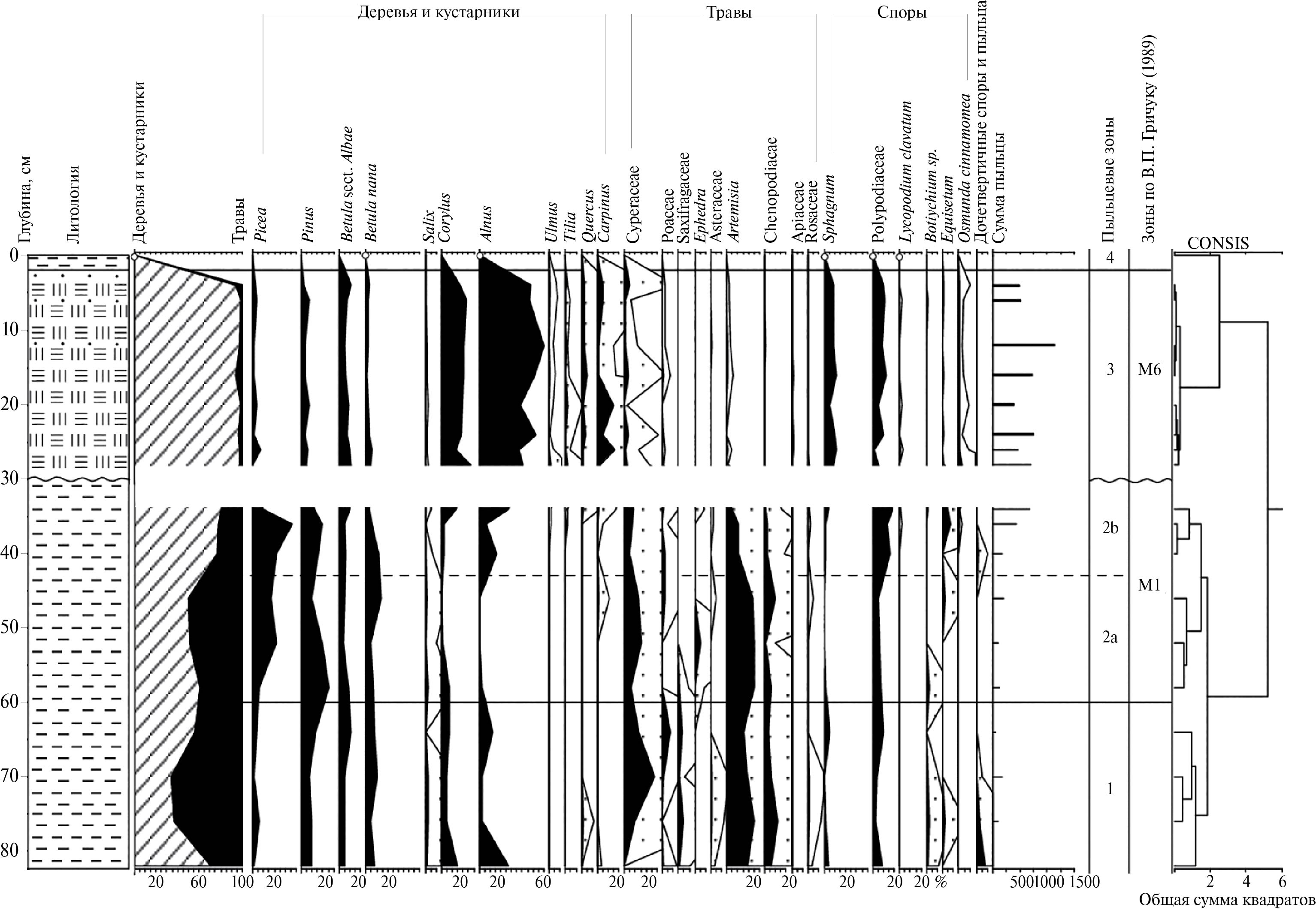 Сопоставление полученных данных с результатами предыдущих исследований отложений на р. Большая Дубенка (Чеботарева и др., 1961; Ананова и др., 1973) выявило сходство полученных спорово-пыльцевых спектров с этапами развития растительности микулинского межледниковья (зоны М1–М7).