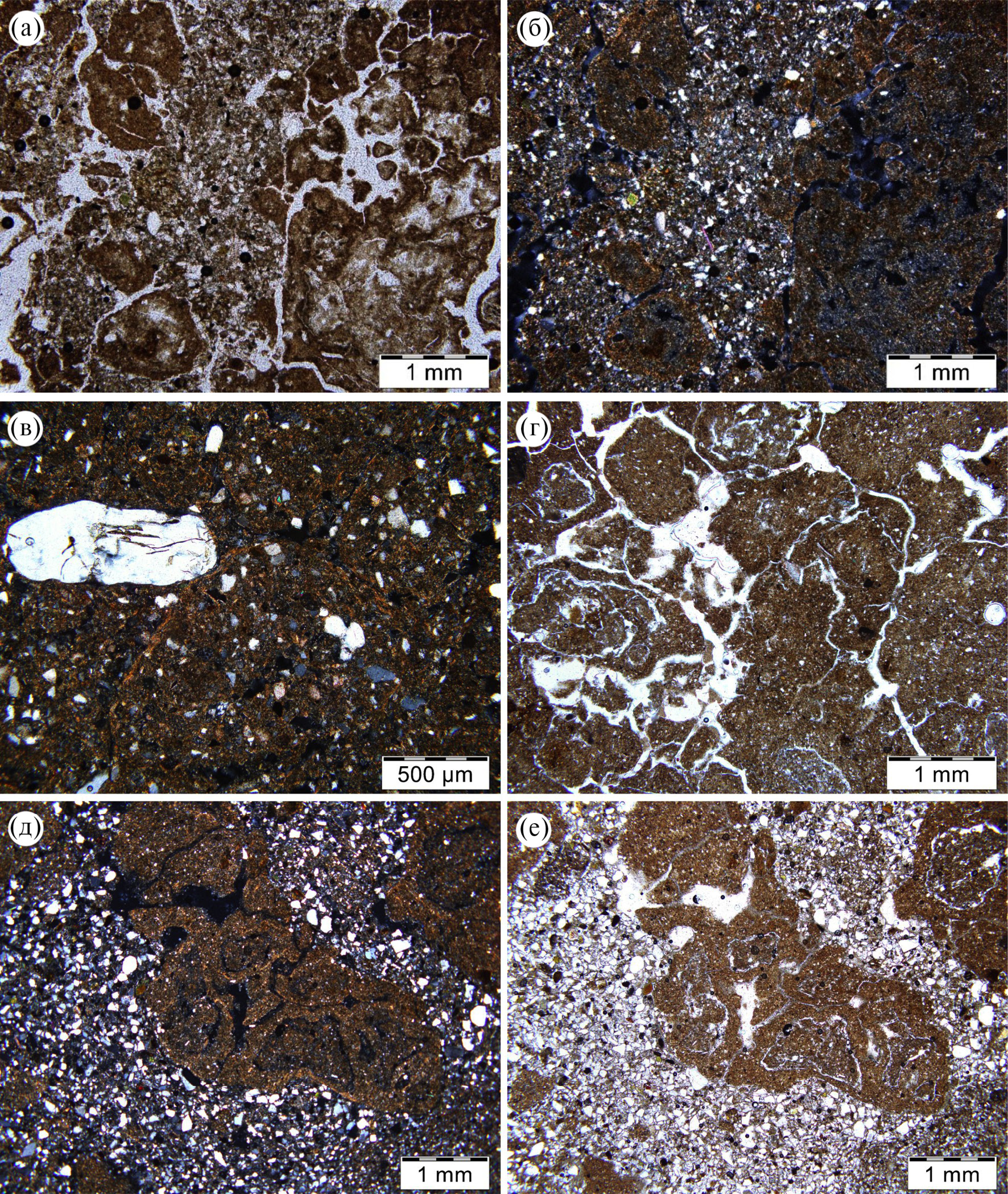Fig. 6. Microstructure of deposits in thin sections: (a–б) – microstructure of surface horizons of MIS 5s paleosols formed on floodplain deposits: cracks filled with silty Atelian material among humus-clay material (SA-5, depth 15.57–15.62 m); (в) – ooid-rounded aggregate with an annular clay film on the surface, fractured quartz (SA-1, depth 6.20 m rel.); (г) – “onion-like” aggregates in the main pore, palaeosol MIS 5a (LN-2, depth 13.73–13.78 m rel.); (д) – filling the crack with material of different composition: in the lower part – layered clayey-silty (water genesis), on the top – fine sand filler (LN-1, depth 7.28–7.38 m rel.); (е) – a combination of different aggregates: angular with sharp noses, lumpy, ellipsoid-like with carbonate nodules (SA-5, depth 15.58–15.63 m rel.)