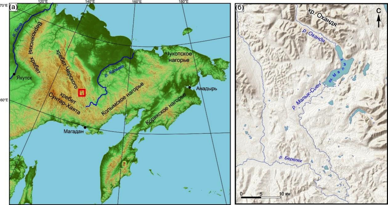 Район исследований расположен в одной из крупнейших горных стран Северо-Восточной Сибири – в хр. Черского (рис. 1, (а)), который представляет собой протяженный горный пояс шириной 400 км при длине 1500 км, состоящий из параллельных, вытянутых с СЗ на ЮВ гряд с максимальными абсолютными высотами чуть более 3000 м. Основной объект исследований расположен в его юго-восточной части и состоит из непротяженных горных массивов, представлявших собой в плейстоцене центры оледенения с системами выводных ледников. Одним из них является хр. Охандя (рис. 1, (б)) северо-западного простирания с абсолютными высотами 2000–2300 м, где широко представлены кары и троги, а также формы аккумулятивного рельефа, связанные с плейстоценовыми оледенениями. Изучение ледниковых форм рельефа и отбор образцов проводились в долине р. Малык-Сиен (рис. 1, (б)).