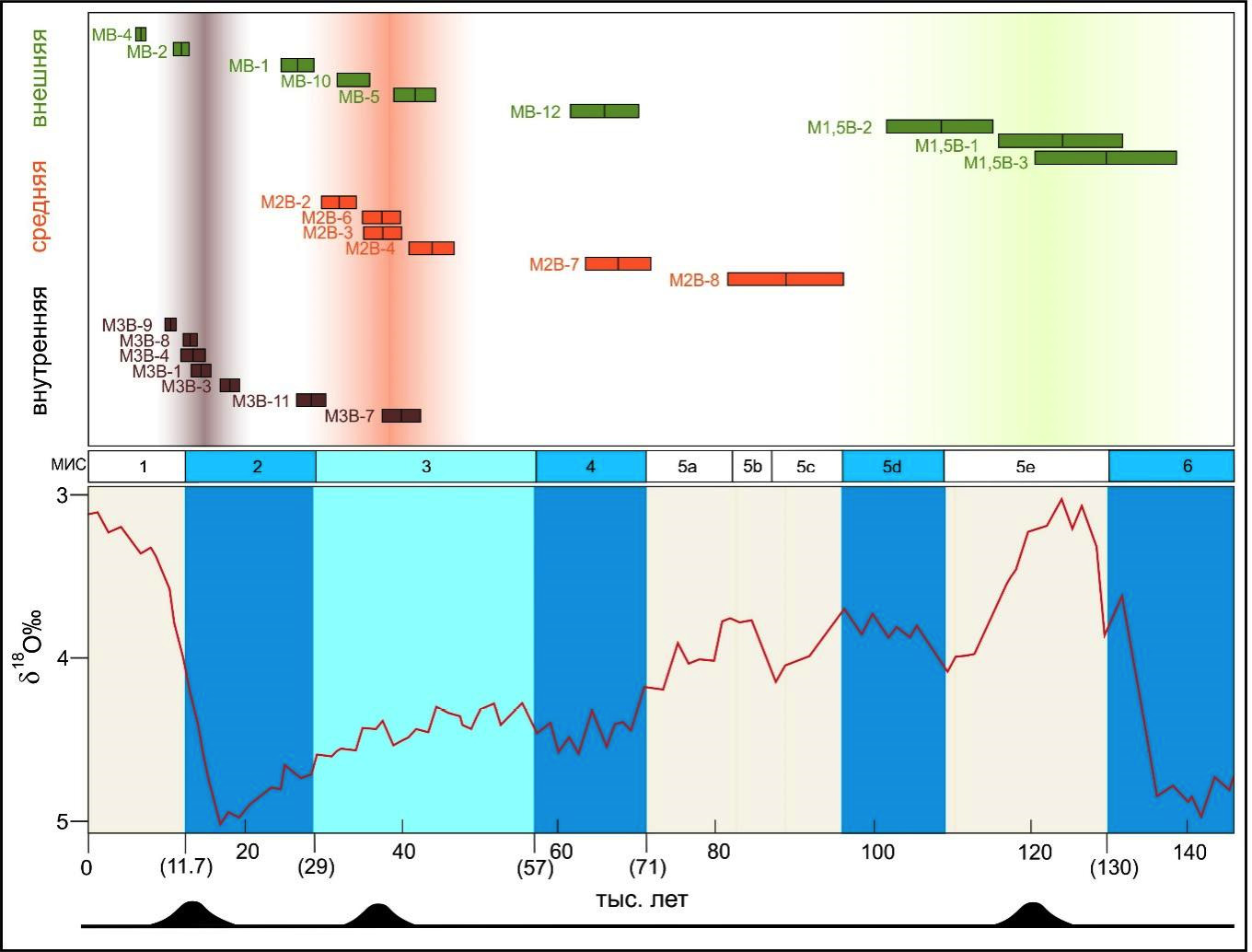 В 1960–1970 гг. были получены первые радиоуглеродные даты для Верхоянского хребта (Кинд, 1975). Их анализ показал, что наиболее древними являются самаровские ледниковые отложения (Q24), выходящие за рамки радиоуглеродного датирования. Причем масштаб распространения самаровской морены был меньше, чем размеры последующих оледенений. Зырянская стадия оледенения (Q32) определена путем датирования перекрывающих ледниковые отложения толщ. Возраст межледниковых отложений колеблется от 40 до 33 тыс. л., т.е. они относятся к каргинскому времени. Следующей по времени является жиганская морена, которая соответствует каргинскому кратковременному похолоданию и могла сформироваться в период между 33 и 30 тыс. л. н. Серию из трех морен Н.В. Кинд (1975) относит к сартанскому оледенению – между 26 и 15 тыс. л. н.