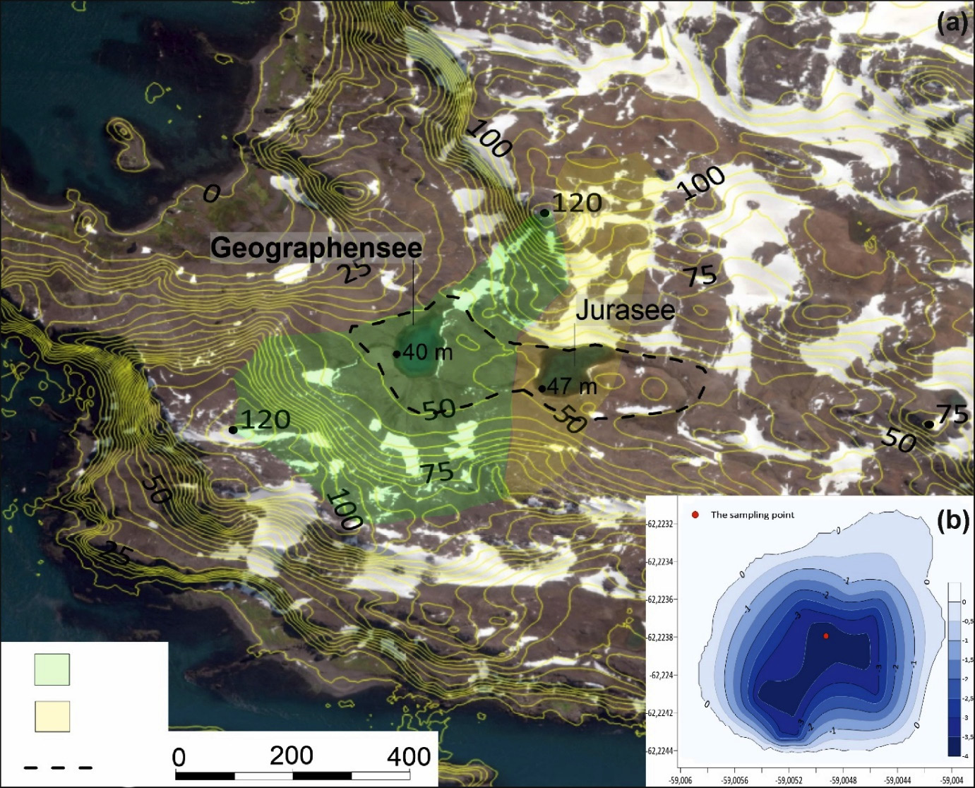 Lake Geographensee with an area of about 0.01 km2 (62°13ʹ00.0ʺ S, 59°01ʹ00.0ʺ W, 40 m a.s.l.) is located next to Lake Jurasee (47 m a.s.l.) in the flat, wide and short valley that crosses the southern tip of the peninsula from northwest to southeast (fig. 2). The elevation of the valley floor ranges from 40 m to 50 m a.s.l., being over all higher around Lake Jurasee than around Lake Geographensee. The valley floor between Lakes Geographensee and Jurasee is flat and elevated by 2–3 m above 50 m a.s.l. Along the northern and southern boundaries of this section of the valley there are short dry stream beds that may have previously connected the lakes if the water level in Lake Jurasee rose to a height of 50 m a.s.l. Lake Geographensee catchment of about 0.2 km2 includes the valley floor and gently descending slopes, that stretch to the northeast and southwest from the lake at the heights of about 65 m a.s.l. into steep slopes of bedrock outcrops. Northwest of the lake the valley bottom descends to the seashore, at first relatively steeply, and then becomes gentle in the coastal part. Currently, the lake’s water outflows from its northwestern part during periods of maximum melting in the summer along the bottom of a narrow channel cut into the valley floor. Judging by the depth of this channel, the lake level in the past could have been several meters higher. The floor of the valley and the lake’s catchment slopes are covered mainly with fine-grained sediments (silt, loam) with mixture of gravel and rubble. Rare vegetation in the catchment area is represented by patches of mosses mostly concentrated in small moist relief irregularities and in the temporary stream beds through which the melted waters from small snowfields flow.
