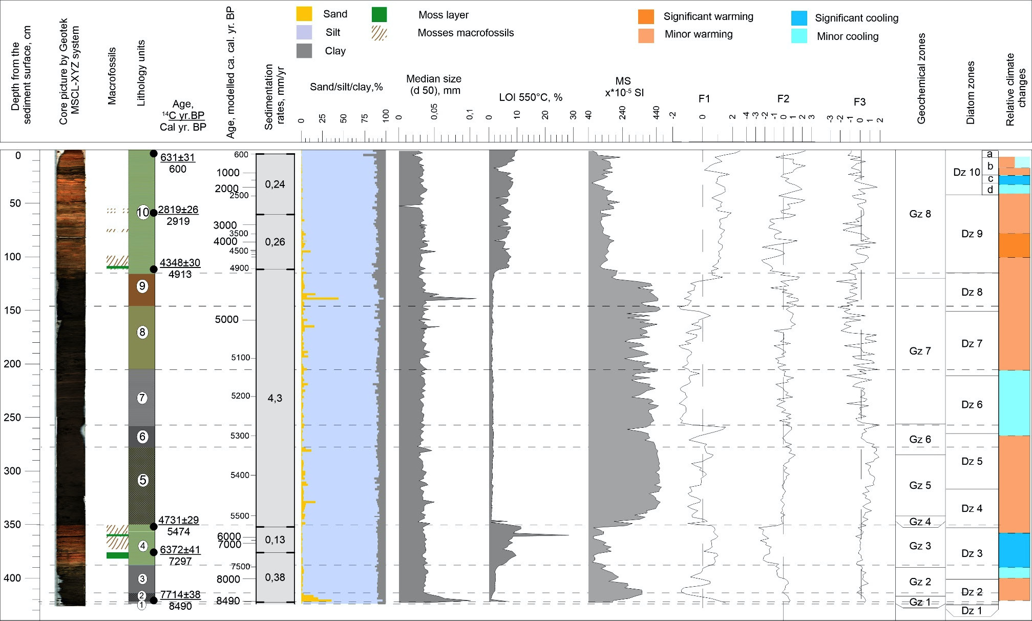 An increase in the values of F1 and F2 factors (upper part of Gz 7) and a decrease in the sand content in the upper part of U8, are associated with a short decrease in the volume of meltwater entering the lake and less water turbulence, that led to an increase in the biogenic elements concentration. This is consistent with the first appearance of larger, more silicified diatom valves in Lake Geographensee’ sediments (Dz 7).