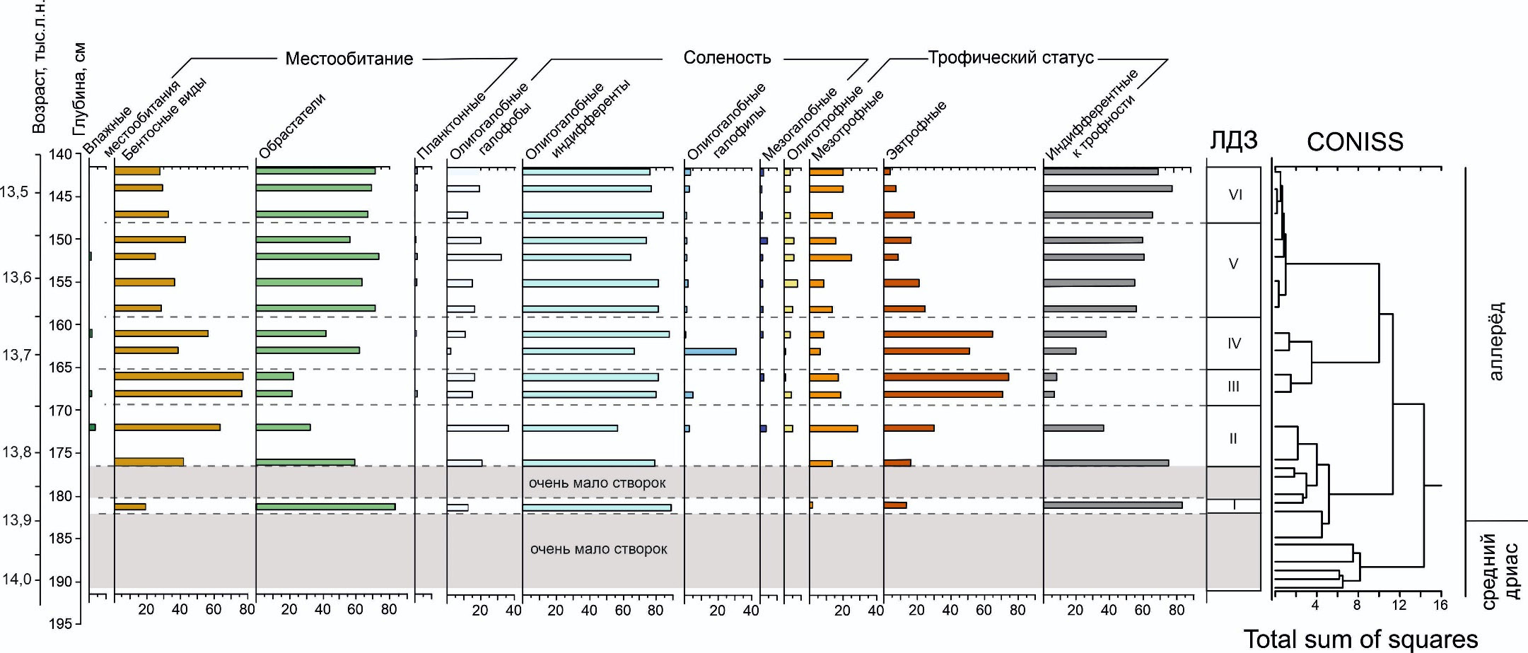 ЛДЗ-VI, 148–141 см (13 540–13 470 кал. л. н). В этой зоне идентифицированы створки 84 видов диатомей. Доминируют обрастатели (67–70%), среди которых преобладают Pseudostaurosira brevistriata (13–24%) и Staurosirella ovata (при этом, их содержание снижается вверх по зоне от 26 до 11%). Содержание бентосных видов составляет 27–33%, видов влажных местообитаний – менее 1%, планктонных видов – 1.5%. Содержание галофобных видов составляет 12–19%, индифферентов – 76–84%. Содержание галофильных видов вверх по зоне повышается от 0.5 до 3.7%, а мезогалобных составляет 1–2%. В то время, как содержание эвтрофных видов снижается вверх по зоне с 18 до 5%, содержание мезотрофных видов, напротив, увеличивается с 13 до 19%. Содержание олиготрофных видов составляет около 3%, индифферентных к трофности видов – меняется в пределах от 65 до 78%. Весовая концентрация меняется в пределах от 2×106 до 3.7×106 створок/г.