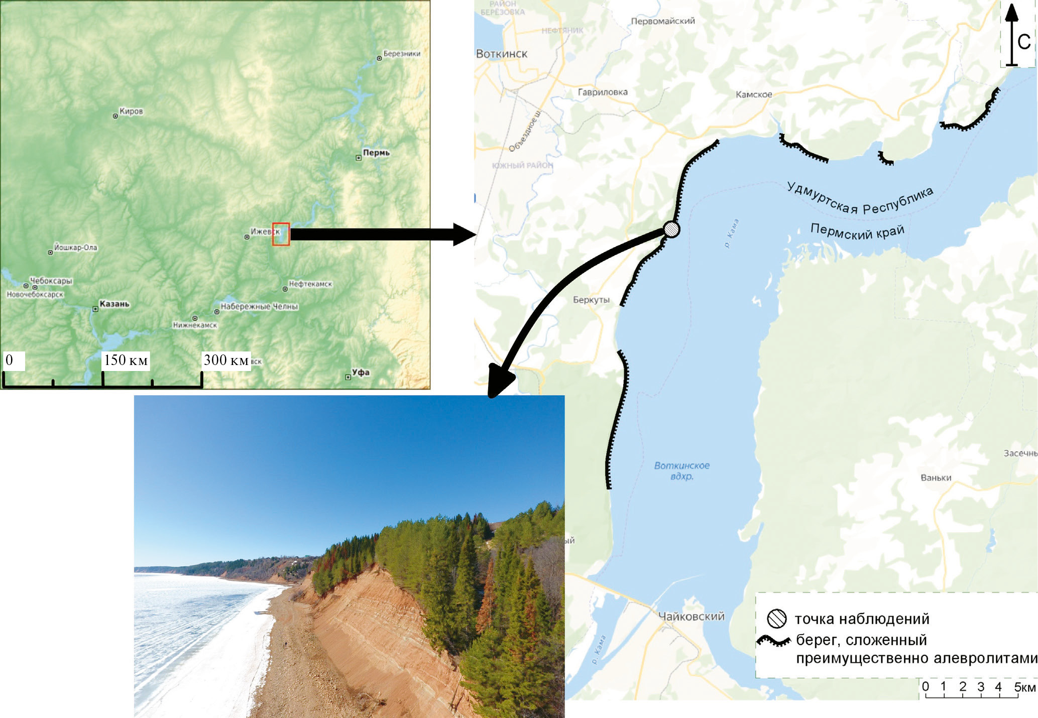 Fig. 1. The location of the observation object and the location of the same type of shores of the Votkinsk reservoir within Udmurtia.