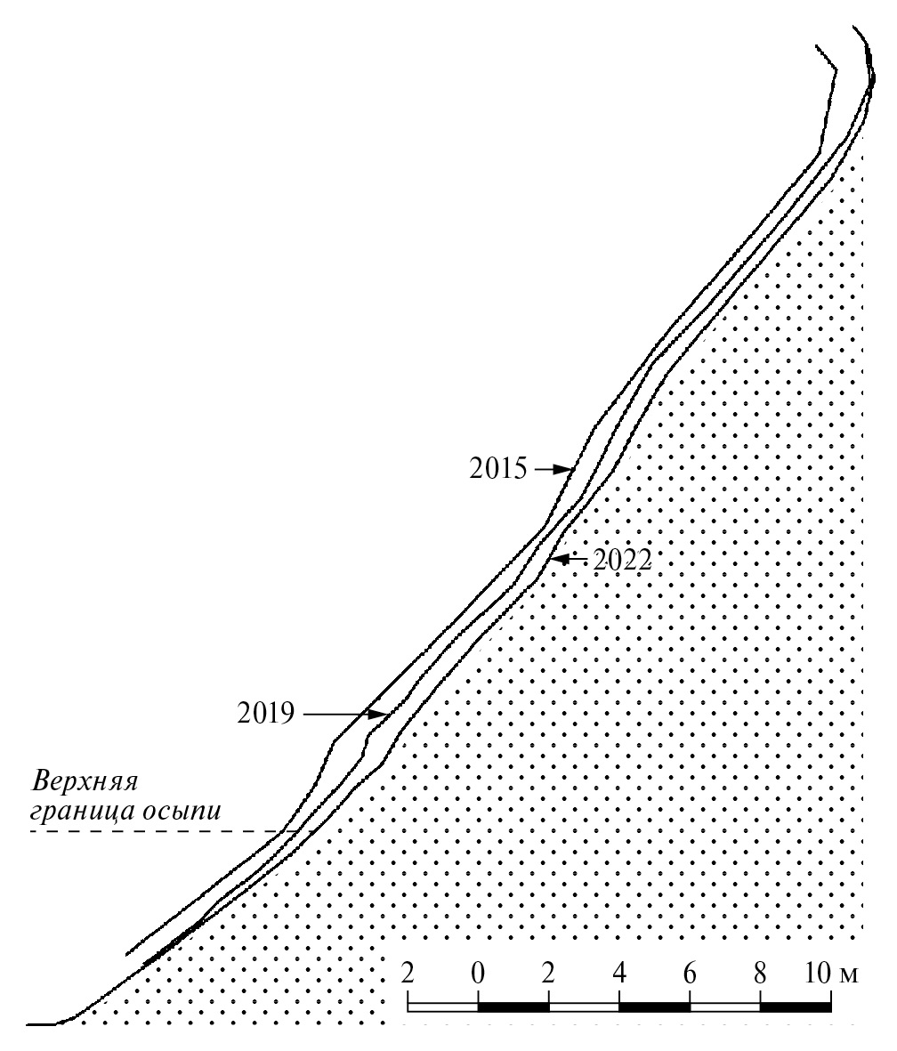 Процессы осыпания выветрелых пород склона являются главным источником поступления рыхлого материала на мелководье. Основная масса коллювия представлена обломками размерности дресвы и более тонким материалом, в основном продуктами выветривания алевролитов. К рыхлому коллювию на мелководье добавляются щебень и глыбы, эти фракции в основном содержатся не в самой осыпи, а скатываются дальше ее подножья и представлены преимущественно песчаником. В результате поверхность склона испытывает параллельное отступание со средней скоростью 14—15 см/год. Поверхность осыпного склона не идеально ровная, и в годовом итоге одни участки отступают сильнее, чем другие. На следующий год активное разрушение наблюдается на других участках, а в многолетнем режиме профили склона оказываются отчетливо параллельными друг другу. Разброс значений отступания за год на профиле составил от 5 до 23 см/год (рис. 4). В результате к подножью самого высокого участка склона на стационаре поступает на каждый погонный метр 6.6—7 м³ пород. Весной у подножья склонов образуются мощные шлейфы коллювия, иногда высотой 4—5 м. Эти шлейфы впоследствии быстро размываются, и уже в конце мая весь коллювий оказывается под водой, а в коренных породах подножий осыпных склонов начинает формироваться неглубокая волноприбойная ниша. В годовом режиме процессы осыпания развиваются неравномерно. Основную массу осыпи дает весенний период — 70—75 % годового объема. Прочие максимумы развития процессов осыпания могут проявляться в разные месяцы летне-осеннего периода и совпадают в основном с пиками выпадения осадков (Агафонов, 1981).
