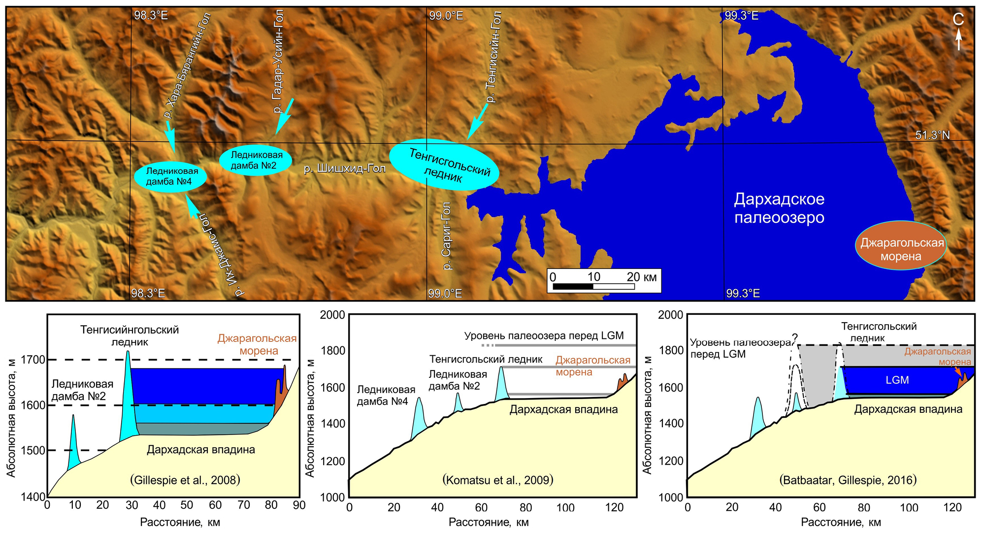 Геолого-геоморфологический анализ, картирование и датирование четвертичных отложений показали, что единственно возможной причиной формирования позднеплейстоценового Дархадского озера могли быть ледники, выходившие из боковых притоков р. Шишхид-Гол (рис. 2) и блокировавшие сток вниз по долине (Гросвальд, Рудой 1996; Krivonogov et al., 2005; Gillespie et al., 2008; Komatsu et al., 2009; Komatsu et al., 2016). С. Кривоногов и др. (Krivonogov et al., 2005) выделил один подпор в районе устья р. Тэнгисйин-Гол. По данным А. Гиллеспи и др. (Gillespie et al., 2008), имелось две ледниковые дамбы в устьях рек Тэнгисйин-Гол и Гадар-Усийн-Гол. Г. Коматсу с соавторами (Komatsu et al., 2009) и Ж. Батбаатар и др. (Batbaatar, Gillespie, 2016a) предположили, что существовало три ледниковые дамбы. Самая нижняя из них располагалась в устье р. Хара-Бярангийн-Гол. Выделяя разное количество ледниковых плотин, исследователи сошлись в едином мнении, что основным подпором являлся ледник, выходивший из долины р. Тэнгисийн-Гол. Остальные ледники, выдвигавшиеся в долину р. Шишхид-Гол ниже устья р. Тэнгисийн-Гол, имели гораздо меньшую абсолютную высоту, и не могли формировать подпор для Дархадского палеоозера (рис. 2) (Гросвальд, Рудой, 1996; Krivonogov et al., 2005; Gillespie et al., 2008; Komatsu et al., 2009; Batbaatar, Gillespie, 2016 a, b; Komatsu et al., 2016).