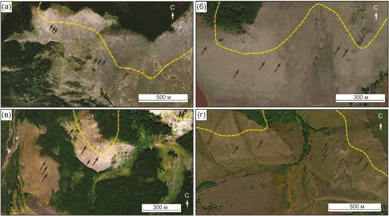 Рис. 4. Положение серии древних береговых линий (черные стрелки), фиксирующих уровень палеоозера ниже устья р. Тенгисийн-Гол. Фон – космические снимки Google Earth. Желтым пунктиром показана изолиния 1713 м над у. м. Все космоснимки относятся к правому борту долины р. Шишхид-Гол.