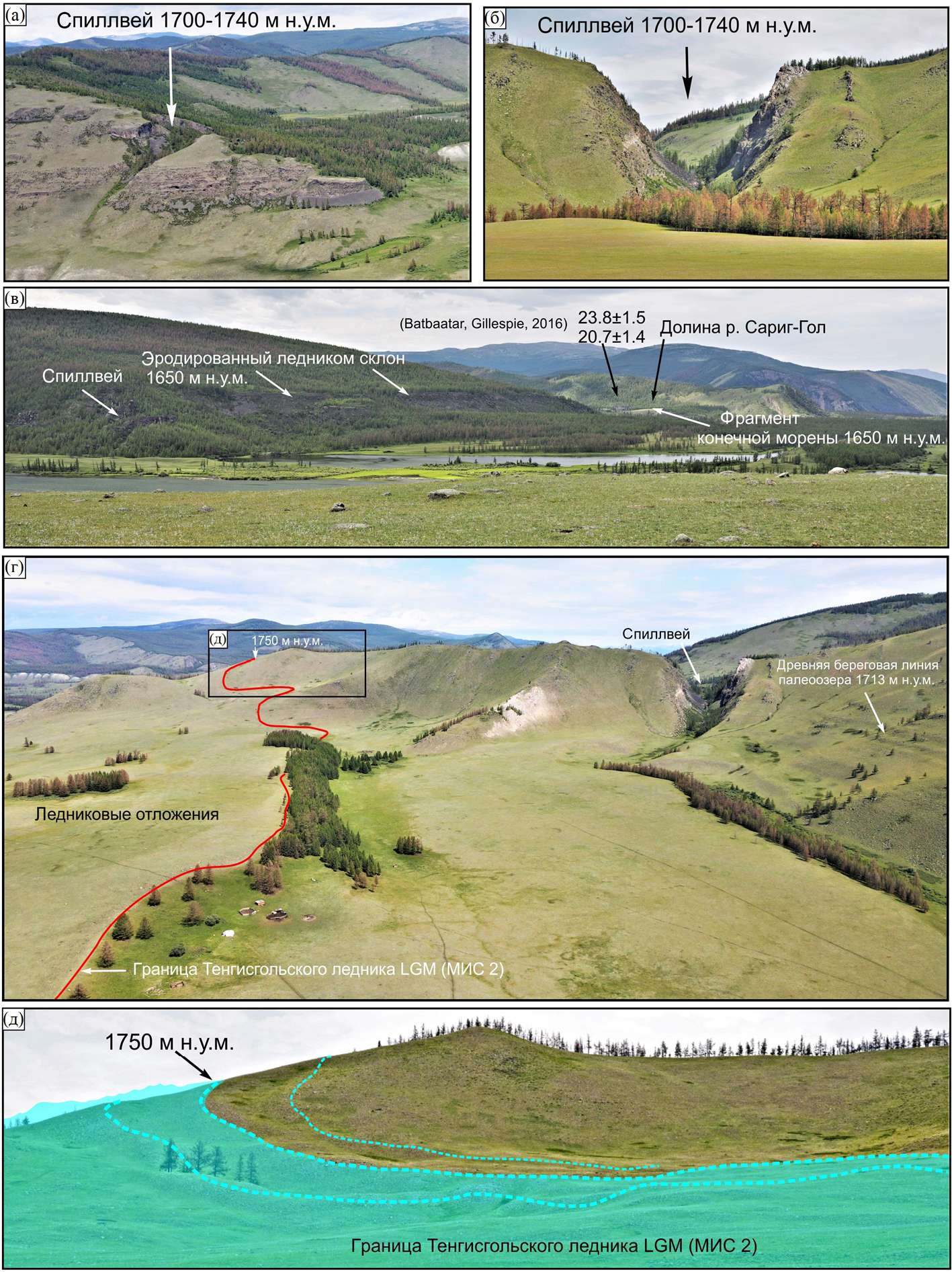 Рис. 8. Реконструкция границы ледника в устье р. Тенгисийн-Гол, существовавшей в последний ледниковый максимум (МИС 2). (а) – спиллвей (эрозионный врез талых ледниковых вод), расположенный на правом берегу р. Тенгисийн-Гол; (б) – спиллвей, расположенный на левом берегу р. Тенгисийн-Гол; (в) – левый берег р. Шишхид-Гол (устье р. Их-Сариг-Гол) и элементы ледникового рельефа (абрадированный ледником склон и фрагмент конечной морены Тенгисийнгольского ледника); (г, д) – реконструкция уровня Тенгисийнгольского ледника (левый борт приустьевой части р. Тенгисийн-Гол) в первую фазу сартанского оледенения (LGM).