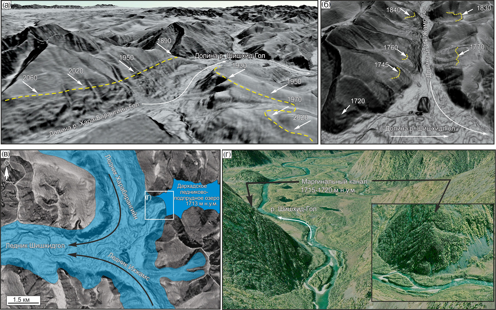Fig. 11. Reconstruction of glaciers of two tributaries of the Shishkhid-Gol (Khara-Byarangiin-Gol and Ikh-Zhams-Gol), which formed the glacial backwater of the Darhad paleolake. The digital elevation model (a, б) shows the valleys of the Khara-Byarangiin-Gol and Ikh-Zhams-Gol rivers, respectively. The numbers indicate the altitude of the lateral moraines. The inset (в) shows the area of confluence of glaciers in the Shishkhid-Gol valley and the formation of a glacier dam. Satellite image (г) shows a series of melt water channels formed along the edge of the glacier.
