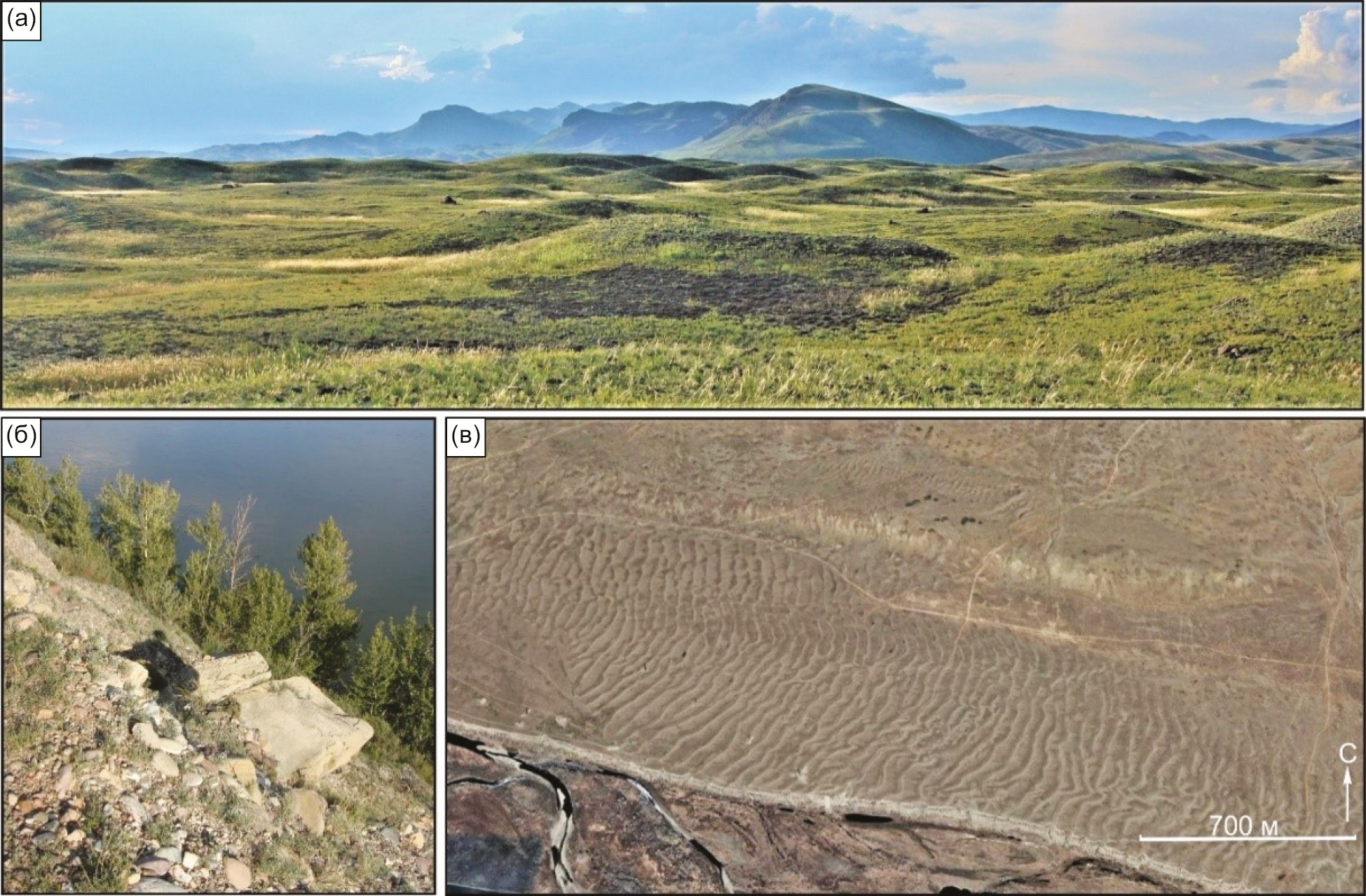 ПГРТ № 3 (51°40.020´N; 94°53.032´E) (рис. 3, (в)). Точки отбора образцов расположены к северо-западу в 0.3–0.7 км от пос. Суг-Бажи. Поле отбора образцов представляет собой систему валов высотой 0.5–0.7 м, расположенную на высоте 14 м над современным уровнем воды в р. Каа-Хем. С этого уровня были взяты 5 образцов (Tuva-16-17, 18, 19, 20, 21).