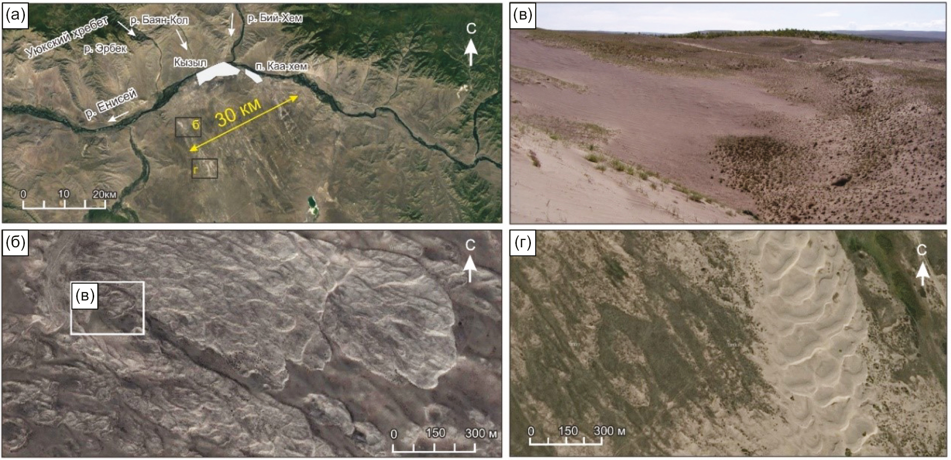 ПГРТ № 1 (51°33.883´N; 93°59.016´E) (рис. 3, (а)) овальной формы расположено на правом берегу р. Улуг-Хем в 30 км ниже по течению от г. Кызыл и составляет 8×2 км. Галечно-валунные отложения залегают на нескольких уровнях сохранившихся террас общей площадью 11.5 км². Максимальная высота над урезом воды составляет 30–40 м, минимальная 14–16 м. Непрерывный переход элементов ГРТ с высокого уровня на более низкий, свидетельствует об одновременном их формировании. Наличие в тыловой части террасы, в области контакта со склоном, значительного понижения и его отсутствие в изголовье дюны, свидетельствует о возможном существовании в прошлом уровня террасы высотой 10–12 м, погребенного в процессе Дархадского суперпаводка. В продольном и поперечном профилях выделяется валообразная структура. На поверхности преобладают валы высотой 1–2 м с увеличением их к центральной части до 6–8 м. На восточной оконечности 35 м террасы с поверхности валунов были взяты 5 образцов (Tuva-16-1,2,3,4,5).