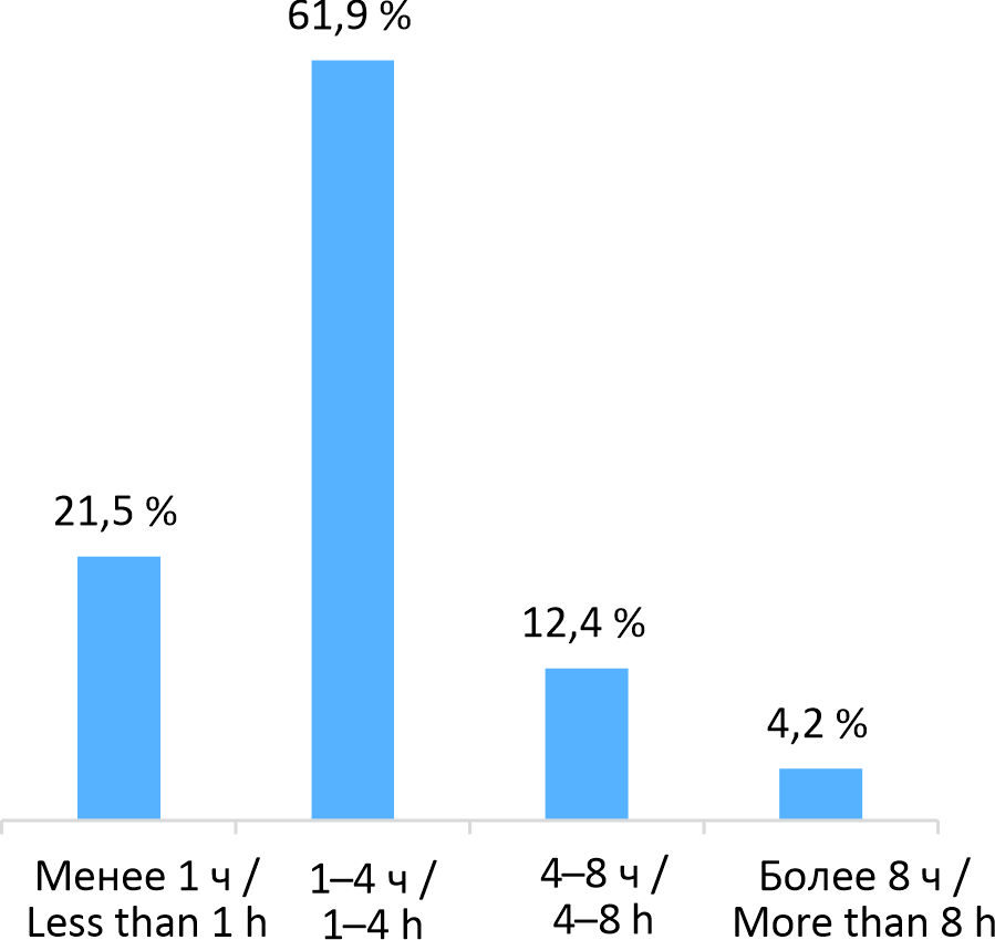 По результатам оценки частоты использования индивидуальных наушников выявлено, что подавляющее большинство (84,5 %) респондентов ежедневно пользуется данным устройством. Продолжительность использования наушников основной массой опрошенных составляет менее 4 ч в сутки (рис. 1), однако две трети студентов используют наушники на средней и выше средней уровнях громкости (рис. 2).