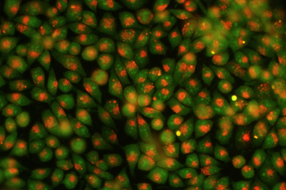 Рис. 2. Двойное флуоресцентное окрашивание (аннексин / пропидий йодид) на примере клеточной линии мышиных фибробластов L929