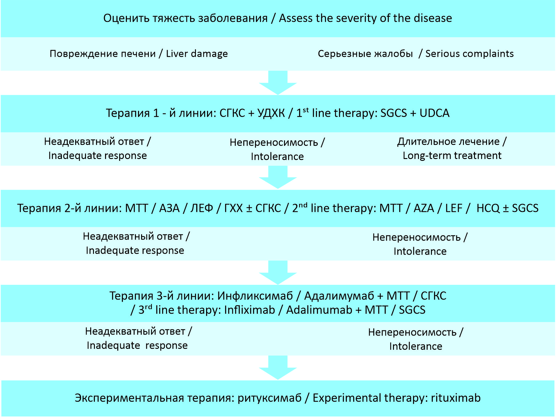 Примечания: СГКС – системные глюкокортикостероиды, УДХК – урсодезоксихолевая кислота, МТТ – метотрексат, АЗА – азатиоприн, ЛЕФ – лефлуномид, ГХХ –гидроксихлорохин