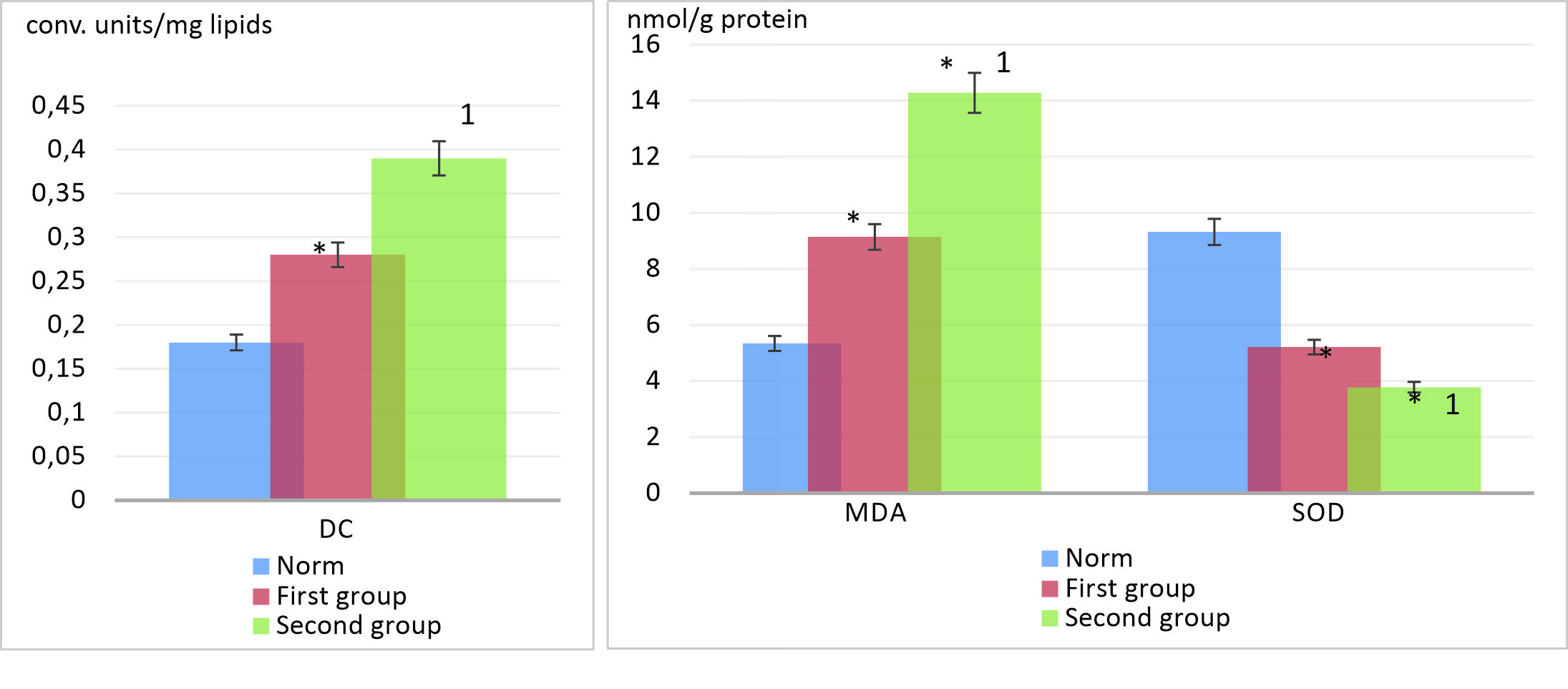 Thus, the level of primary products of lipid peroxidation of DC increased by 39.3% (p < 0.05), respectively, compared with the first group, and the activity of superoxide dismutase decreased by 27.5% (p < 0.05).