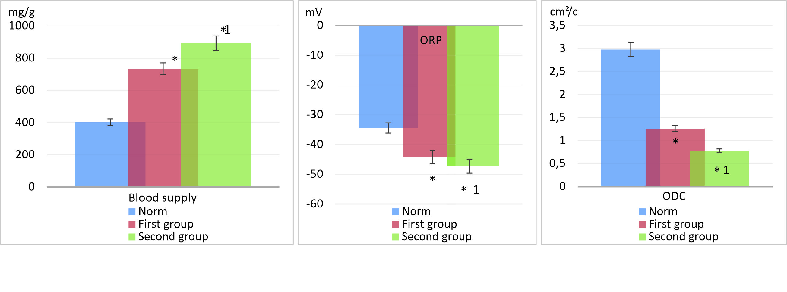*1 – the significance of the difference in relation to the data of the first group at p < 0.05,