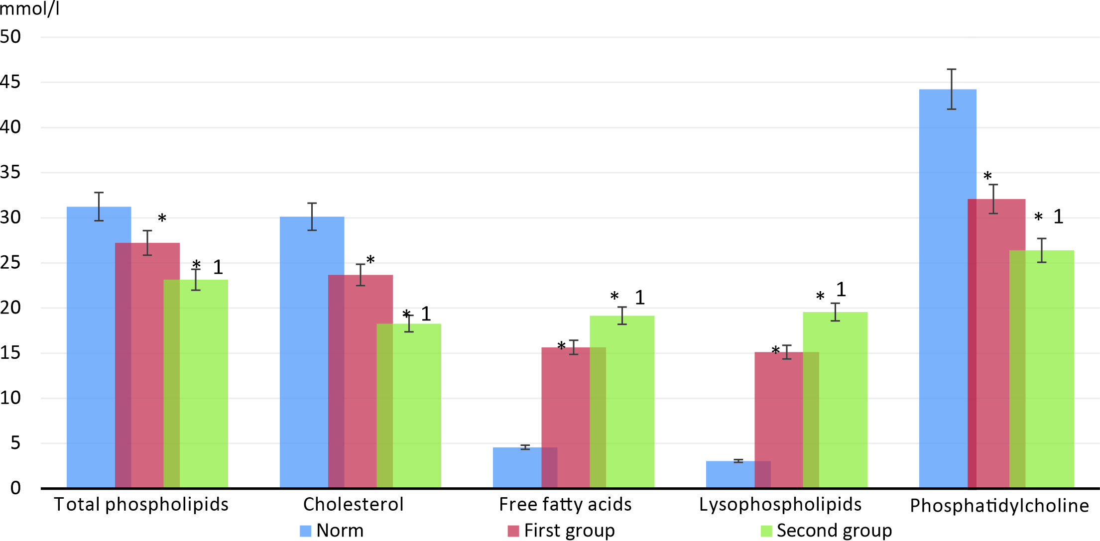 It should be emphasized that, in general, changes in the qualitative and quantitative composition of phospholipids in the more severe form of peritonitis were also more pronounced. Other things are also noted. The most noticeable changes were in the levels of lysophospholipids, phosphatidylcholine, and phosphatidylethanolamine. Thus, compared with the first group, the levels of lysophospholipids and phosphatidylethanolamine increased by 29.3 and 20.7% respectively (p < 0.05), phosphatidylcholine decreased by 17.8% (p < 0.05).