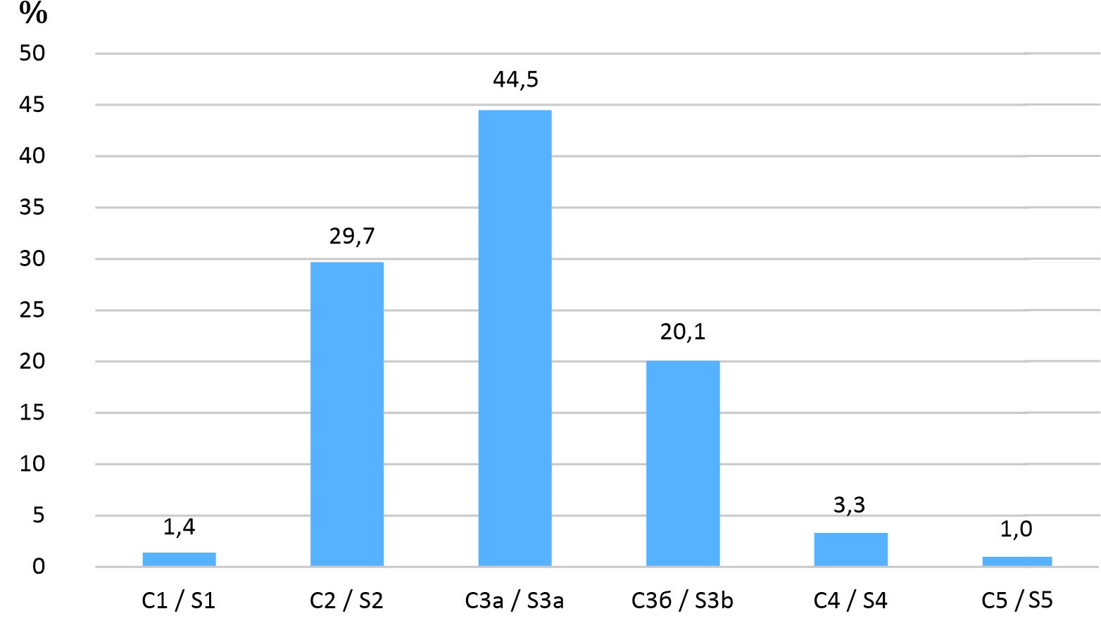 В регистре представлены данные 1 704 пациентов с СД 2 типа. Распространенность ХБП при СД 2 типа составила 19,07 %: у 102 мужчин и 223 женщин. Наиболее часто встречалась хроническая болезнь почек С3а стадии, на втором месте оказалась ХБП С2 стадии, на третьем – ХБП С3б стадии. Меньше всего наблюдалось пациентов с ХБП С 1, 4 и 5 стадии (рис. 1).