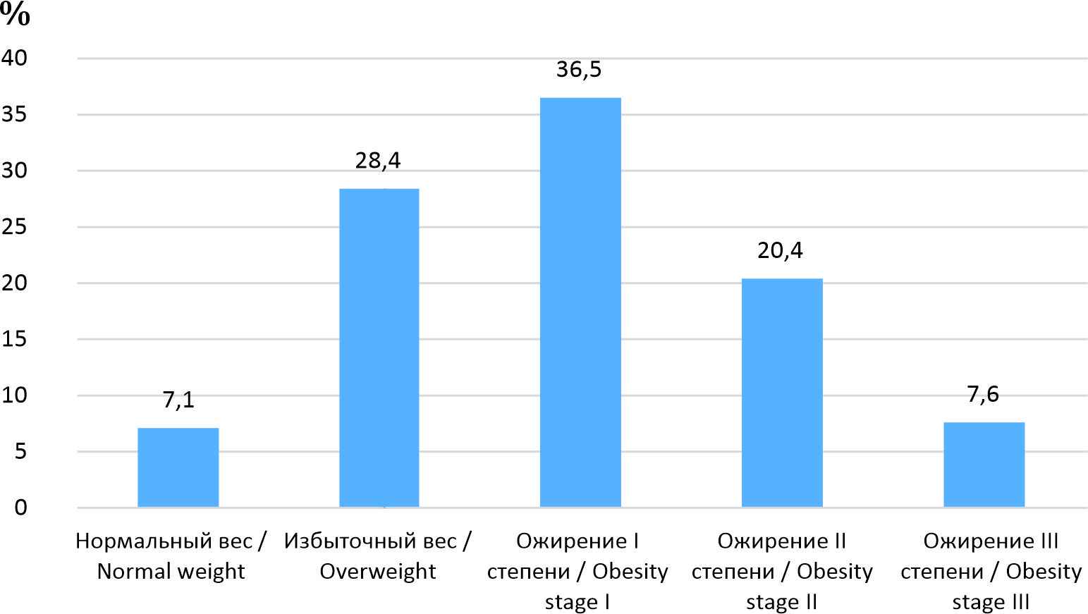 Рис. 2. Распределение пациентов с сахарным диабетом 2 типа и хронической болезнью почек по индексу массы тела, %
