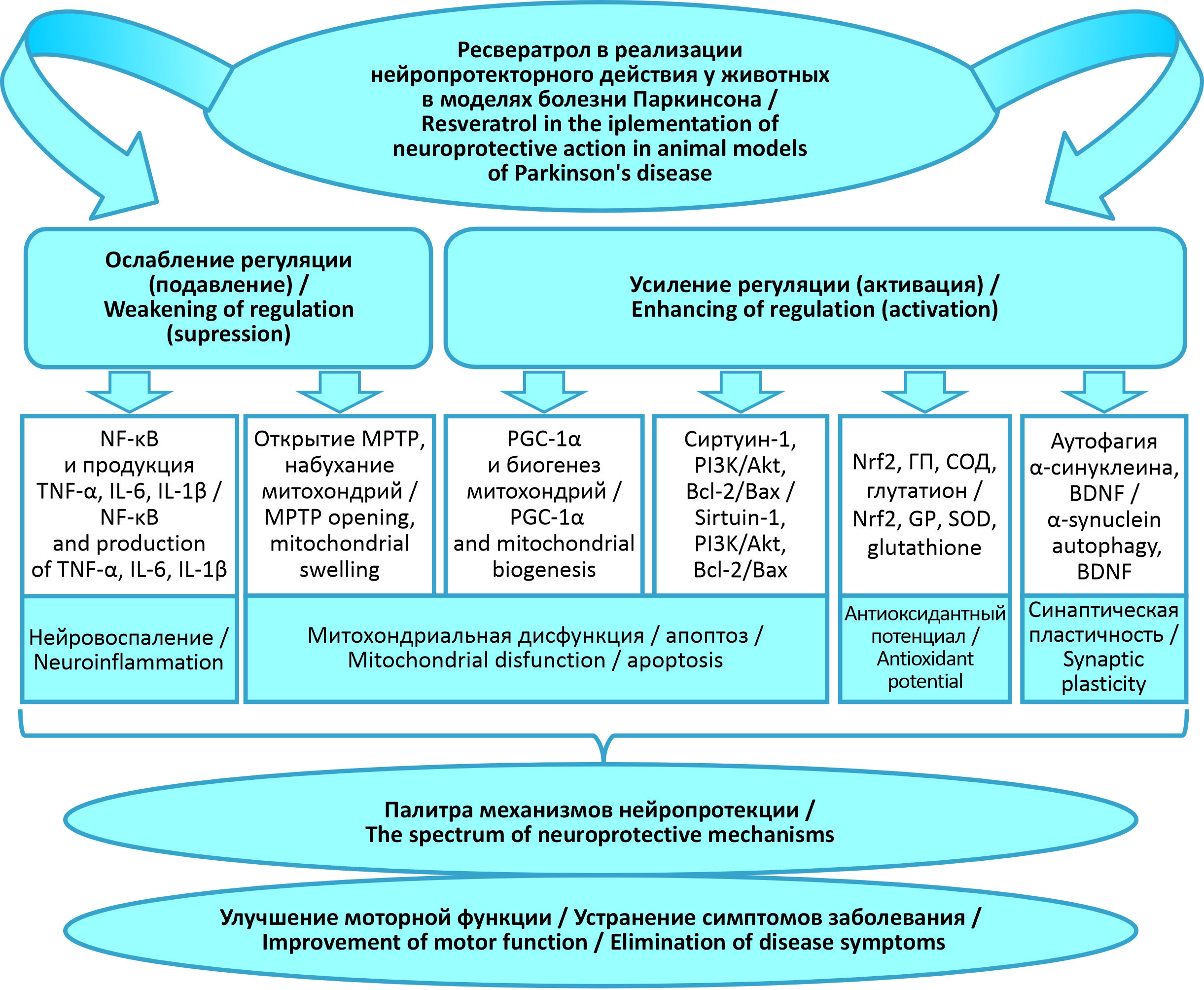 Таким образом, в большинстве проведенных исследований установлено, что ресвератрол повышает уровень дофамина и его метаболитов, увеличивает экспрессию белка дофаминовых рецепторов в полосатом теле, снижает экспрессию α-синуклеина и улучшает антиоксидантный статус нейронов, уменьшает нейровоспалительные реакции и регулирует митохондриальную дисфункцию [11] (рисунок).