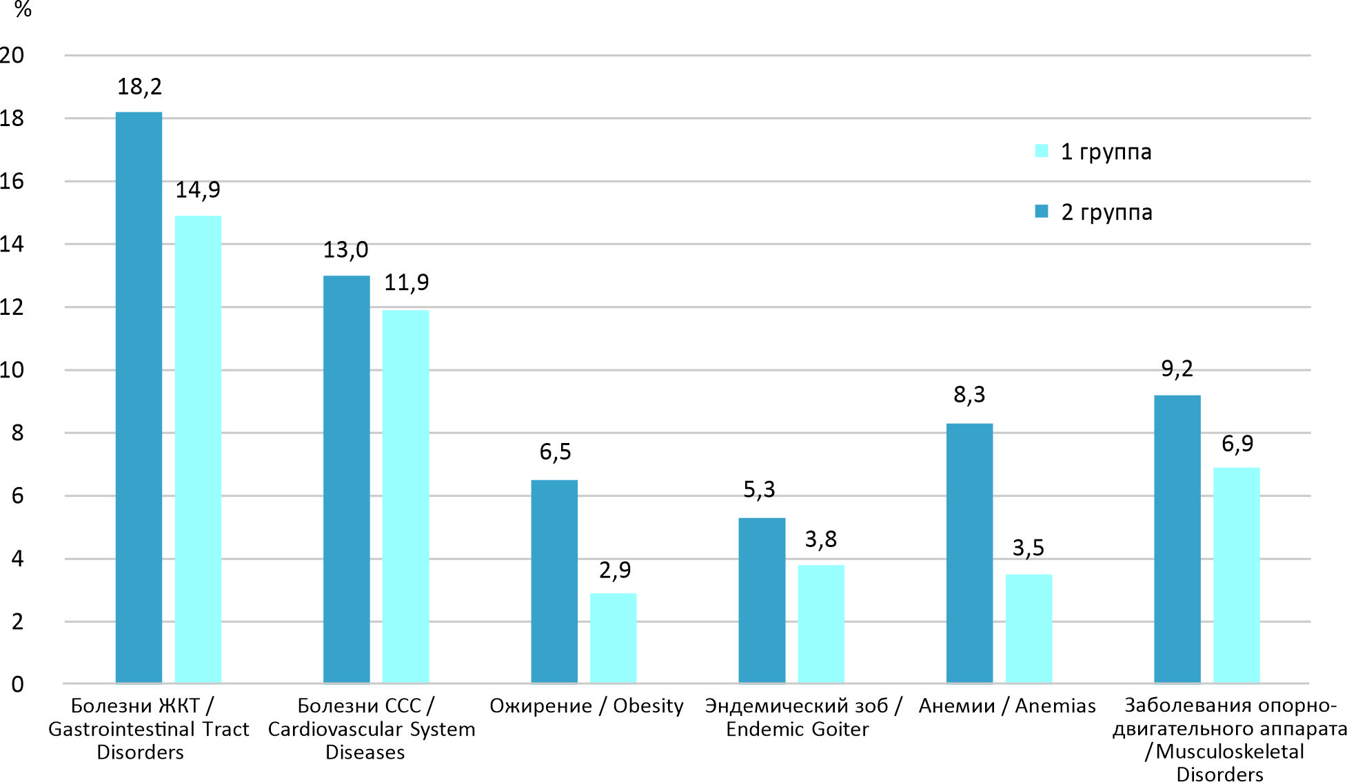 Fig. 2. Prevalence of chronic diseases in schoolchildren based on the results of medical examinations (Group 1 – children receiving social nutrition, Group 2 – children receiving traditional nutrition)