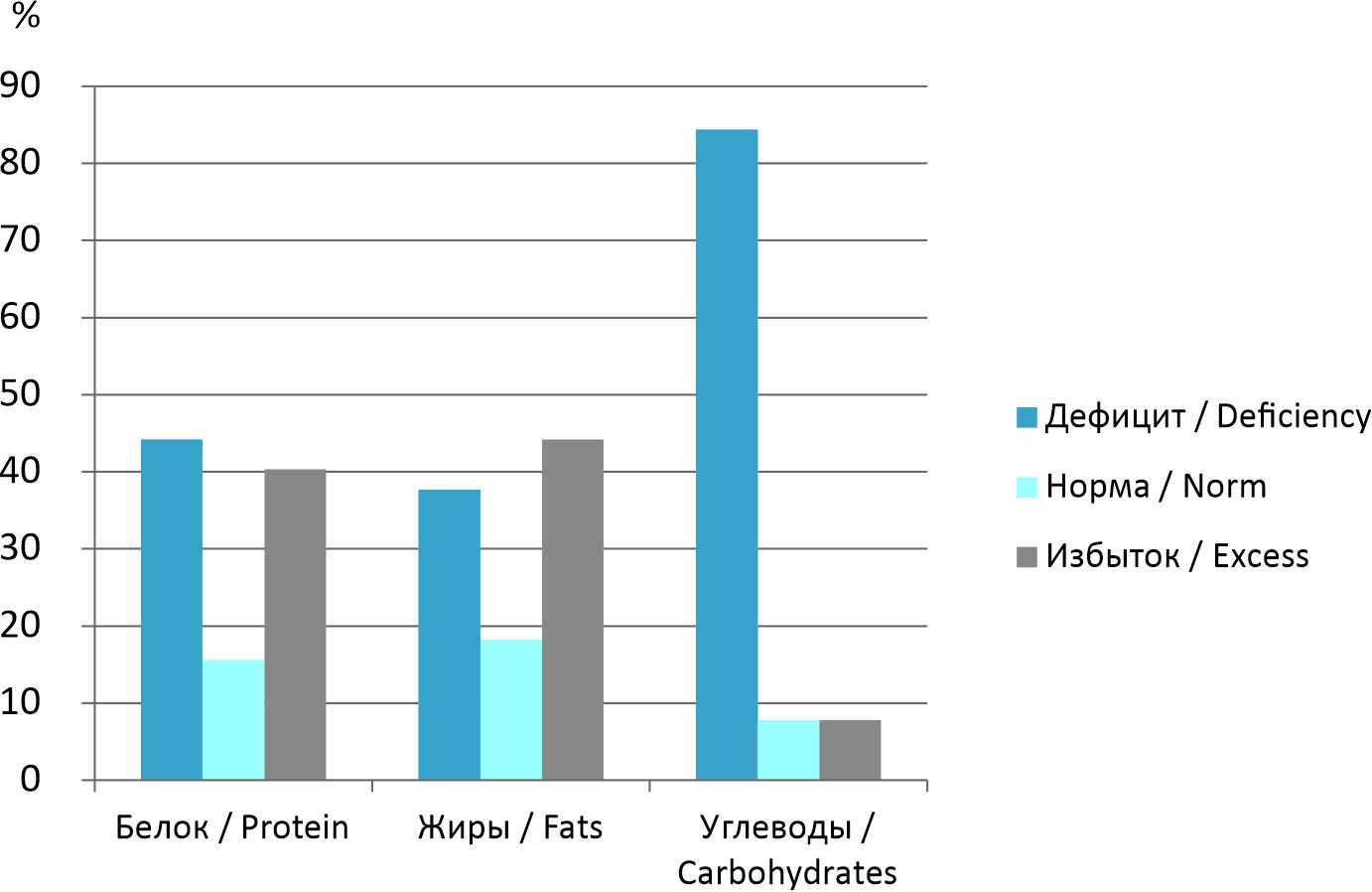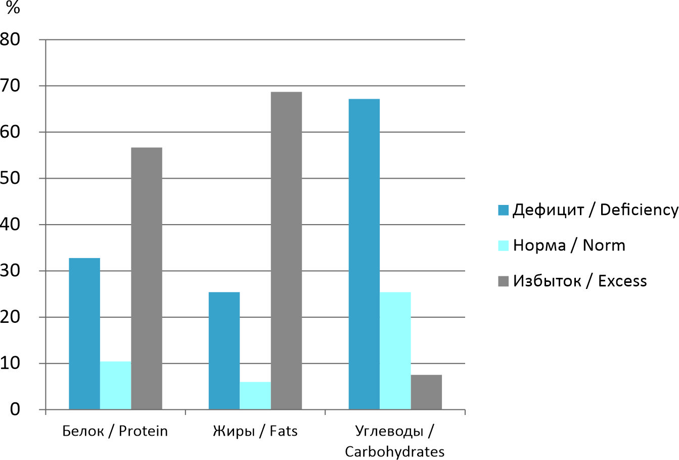 По мере взросления дети все реже придерживаются принципов здорового питания и чаще отдают предпочтение ультрапереработанной пище. Около 10–15 % детей имеют в суточном рационе питания недостаточное количество фруктов, 15–22 % – овощей (и как следствие – дефицит пищевых волокон и углеводов в рационе), 9–18 % – молочных продуктов (дефицит кальция), 20–23 % – мяса и птицы (дефицит белка), более 50 % – рыбы (дефицит белка и полиненасыщенных жирных кислот). Вместе с тем, 40–50 % детей регулярно потребляют колбасные и кондитерские изделия, что сопровождается избыточным поступлением соли и может в дальнейшем негативно сказаться на уровне артериального давления и состоянии почек [3].