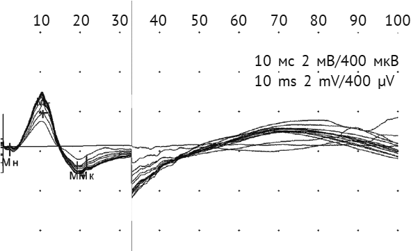 Рис. 2. Типичные изменения Н-рефлекса у пациентки 13 лет с острой воспалительной демиелинизирующей полиневропатией, 6-е сутки от развития первых симптомов. Параметры электронейромиографии: амплитуда М-ответа — 2,3 мВ, соотношение Н/М — 0 %
