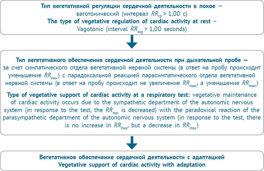 Fig. 5. An example of vegetative support of cardiac activity with disadaptation (the normal reactivity of the parasympathetic department and the paradoxical reaction of the sympathetic department of the autonomic nervous system)
