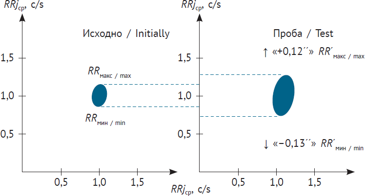Наглядный пример вегетативного обеспечения сердечной деятельности с дезадаптацией за счет низкой реактивности обоих отделов ВНС представлен на рис. 4. Из рисунка видно, что исходно по КРГ определяется ваготонический тип вегетативной регуляции (RRср = 1,1 с). При дыхательной пробе отмечается недостаточная реакция парасимпатического отдела ВНС, поскольку исходно значение интервала RRмакс = 1,16 с, при дыхательной пробе интервал RR’макс = 1,2 с, то есть произошло увеличение RR’макс только на 0,04 с (при норме 0,05–0,10 с). Это отражает недостаточную реактивность парасимпатического отдела ВНС на функциональную пробу. Исходно значение интервала RRмин = 0,77 с, а при дыхательной пробе интервал RR’мин = 0,73 с, то есть он уменьшился на 0,04 с (при норме 0,05–0,10 с). Эти изменения свидетельствуют о вегетативной дисфункции с низкой реактивностью симпатического отдела ВНС на функциональную пробу.