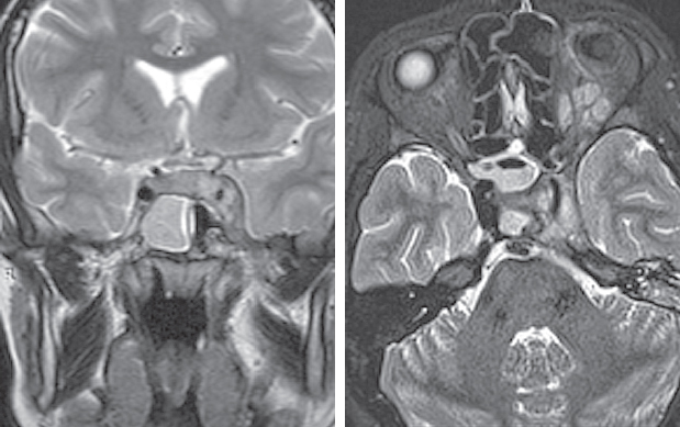 Рис. 5. Магниторезонансная томография головы от 10.11.2021: правосторонний сфеноидит, тромбоз кавернозного синуса слева. Слева — коронарная проекция в режиме Т2. Тотальное затенение правой половины пазухи клиновидной кости, сужение кавернозного синуса слева; справа — аксиальная проекция в режиме Т2. Признаки тромбоза кавернозного синуса слева