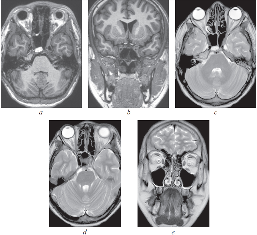 Рис. 7. Магниторезонансная томография головного мозга от 24.11.2021: а — аксиальная проекция в режиме Т1. Пневматизация пазухи клиновидной кости практически полностью восстановлена; b — коронарная проекция в режиме Т1. Сифоны внутренних сонных артерий имеют одинаковый просвет; c — аксиальная проекция в режиме Т2. Улучшение пневматизации правой основной пазухи; d — аксиальная проекция в режиме Т2. Отсутствие экзофтальма левого глаза, купирован отек ретробульбарной клетчатки слева. Увеличение просвета сифона внутренней сонной артерии слева; e — коронарная проекция в режиме Т2. Пневматизация верхнечелюстной пазухи слева полностью восстановлена