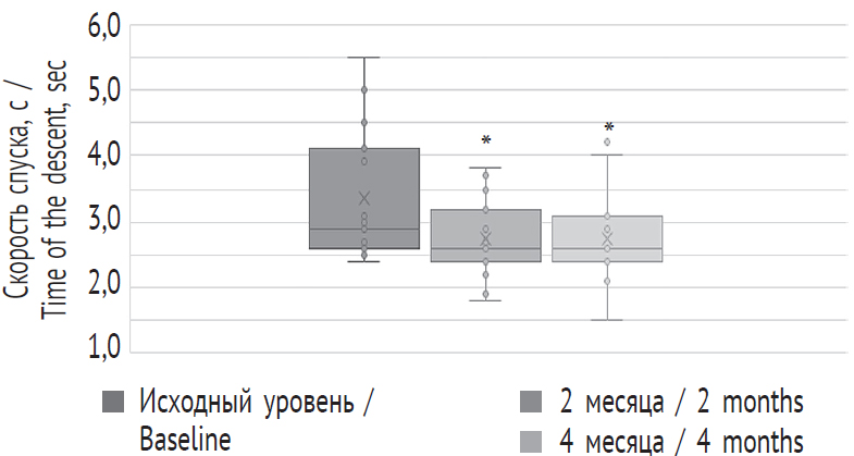 Рис. 5. Динамика изменения скорости спуска на 4 ступени. * p < 0,05 / Fig. 5. Dynamics of the time of the 4 steps descend. * p < 0.05