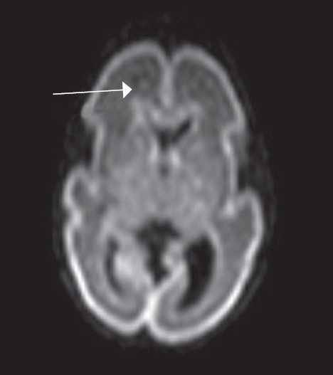 Рис. 7. МРТ головного мозга недоношенного ребенка (ПКВ 34 недели). ДВИ, аксиальная проекция, герминальный матрикс визуализируется вдоль наружных стенок боковых желудочков (отмечен стрелками)