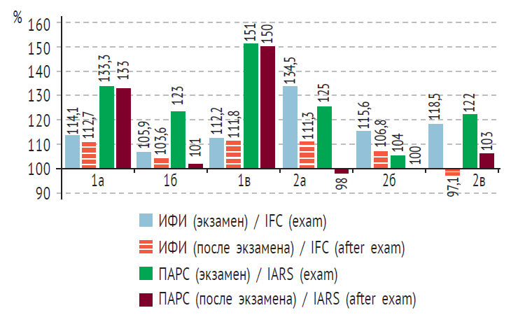 Изменение ИФИ в 1а и 1в подгруппах сохранялось на уровне «напряжения механизмов адаптации»: от 2,5 (2,3–2,9) балла (р < 0,06) до 2,6 (2,4–2,9) балла (р < 0,06) соответственно.