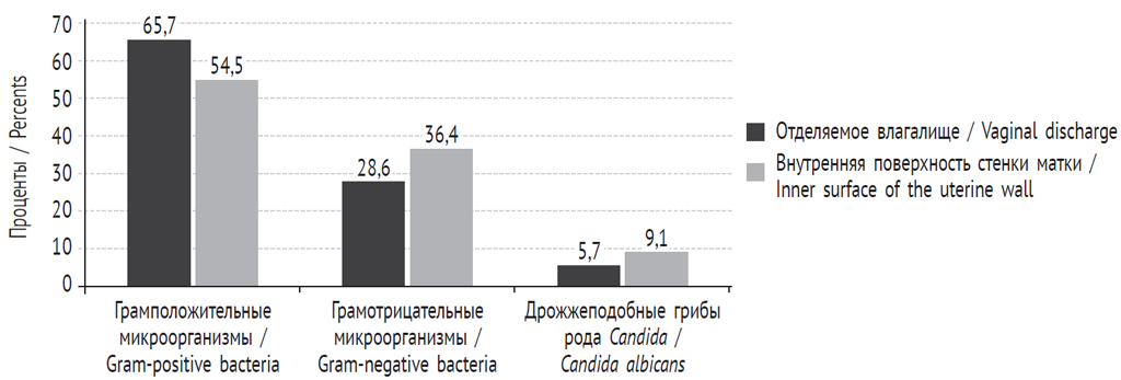 Рисунок. Частота выделения микроорганизмов из отделяемого влагалища и с внутренней поверхности стенки матки у женщин основной группы