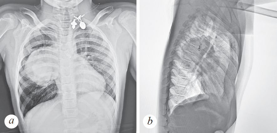 Рис. 1. Пациент, 8 лет. Прямая (a) и правая боковая рентгенограмма (b) грудной клетки — справа, в проекции S6, огромное образование с ровными и четкими контурами, плотной интенсивности, не сопровождающееся нарушением проходимости бронхов