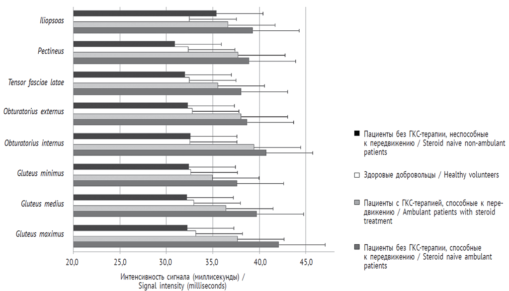 Группа пациентов, не получавших ГКС-терапии и способных к передвижению, характеризовалась повышением интенсивности сигнала Т2 от воды во всех скелетных мышцах тазового пояса, средние значения составляли 39,4 ± 1,0 мс. В группе пациентов, получавших ГКС-терапию и способных к передвижению, были выявлены повышенные показатели сигнала Т2 от воды во всех скелетных мышцах тазового пояса в среднем до 37 ± 0,9 мс. В группе пациентов, не получавших ГКС-терапии и неспособных к передвижению, интенсивность сигнала Т2 от воды составила 32,5 ± 1,8 мс. Интенсивность сигнала Т2 от воды в мышцах тазового пояса здоровых добровольцев в среднем равнялась 32,7 ± 0,7 мс (рис. 1).
