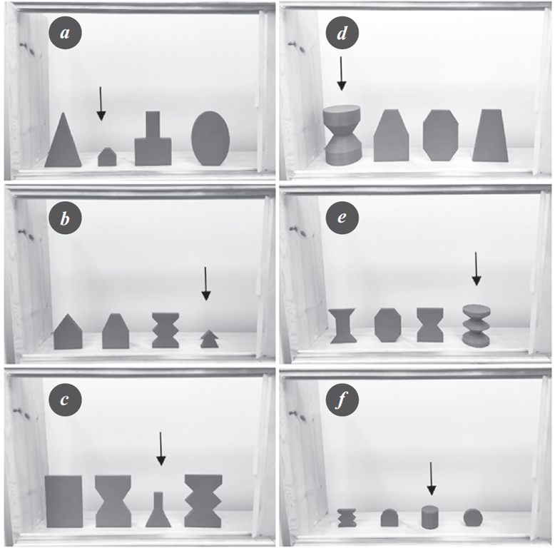 Любая проба (определенное сочетание четырех фигур при одновременном их предъявлении) начиналась с того, что вначале отодвигался в сторону непрозрачный экран: ребенок при этом мог/ла видеть в ряд стоящие вдоль экранов 4 фигуры, но не мог/ла до них дотянуться. Затем, через 10 с отодвигался прозрачный экран, и ребенок мог/ла выбрать любую из этих четырех фигур путем сдвигания ее пальцем. Если ребенок выбирал/а правильную фигуру, то он/а получал/а подкрепление в этой пробе (ассистент выдавал бумажную наклейку). Если ребенок ошибался/ась, то он/а не получал/а подкрепления в этой пробе. Четыре фигуры в каждой пробе располагали в псевдослучайном порядке, чтобы предотвратить формирование рефлекса на определенную фигуру и/или на ее место в ряду. Примеры геометрических фигур в пробах на формирование понятия «большего/меньшего» размера (а–c) и понятия «плоской/объемной» формы (d–g) представлены на рис. 1.