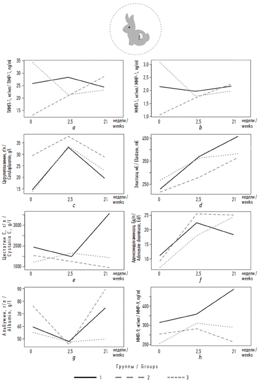 Третий вариант изменений был выявлен при исследовании ММП-9 и ЦС. Концентрации этих белковых маркеров значимо различались между группами и сроками исследования. Через 2,5 нед. отмечалась лишь тенденция к повышению концентраций ММП-9 и ЦС во всех группах (рис. 1, g, h). Но к окончанию эксперимента величины показателей повысились (р < 0,05) у зараженных нелеченных кроликов, тогда как в группах с лечением они снизились почти до исходного уровня. Наиболее высокие концентрации протеиназы и ингибитора катепсина отмечались у зараженных нелеченных животных (р = 0,04). Различий обоих маркеров по фактору времени (р = 0,19) и эффекта взаимодействия фактора группы и времени установлено не было (р = 0,18). Во всех трех группах животных отмечался прирост массы тела в ходе эксперимента (р = 0,003), но его величина в группе 1 была минимальной (р = 0,02).