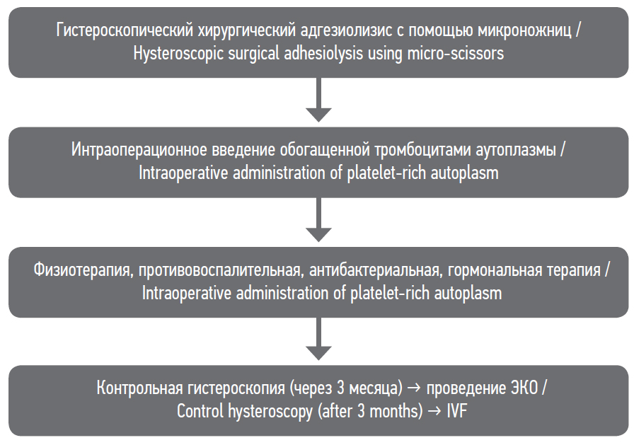 В рамках протокола клинической апробации, инициированной Федеральным государственным бюджетным учреждением «Национальный медицинский исследовательский центра акушерства, гинекологии и перинатологии им. акад. В.И. Кулакова» Минздрава России, «Метод комплексного лечения женщин репродуктивного возраста с внутриматочными синехиями с использованием минимально инвазивного адгезиолизиса в сочетании с комбинированным внутриматочным введением АОТ, и циклической гормональной терапией, по сравнению с пациентками, получившими только хирургическое и гормональное лечение», на базе Перинатального центра ФГБОУ ВО «Санкт-Петербургский государственный педиатрический медицинский университет» Минздрава России (СПбГПМУ) проведено проспективное клиническое исследование с участием 30 женщин с бесплодием, обусловленным синдромом Ашермана, включенными в протокол по проведению экстракорпорального оплодотворения (ЭКО)1. Продолжительность апробации: 03.2021–12.2022. Критерии включения: 1) наличие гистероскопически диагностированного синдрома Ашермана (код МКБ-10 N85.6 «Внутриматочные синехии»); 2) отсутствие противопоказаний для проведения программы ЭКО2; 3) согласие на проведение протокола клинической апробации. Критерии исключения: пороки развития матки, гиперпластические процессы эндометрия, полипы цервикального канала и эндометрия, аденомиоз и туберкулез половых органов, индекс массы тела более 30 кг/м2.